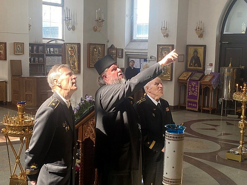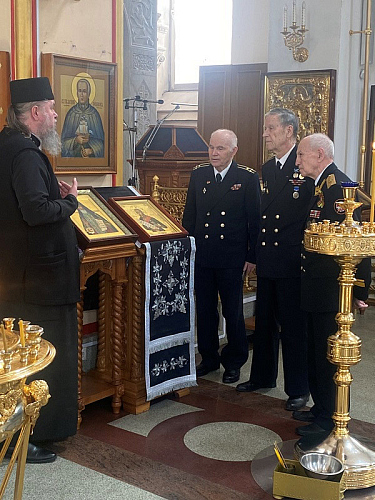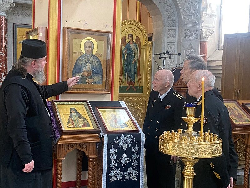Внутри храма игумен Дамиан рассказал гостям о тех событиях жизни Небесного покровителя храма - святого адмирала Феодора Ушакова и других Святых, которые стали примерами добродетели, преданности, смелости и скромности.