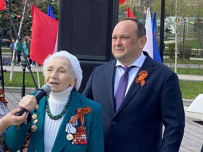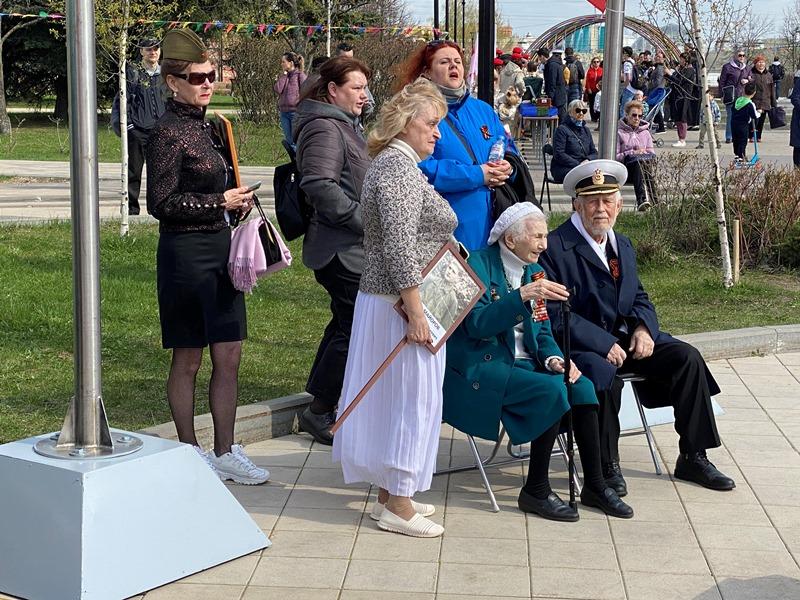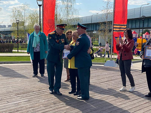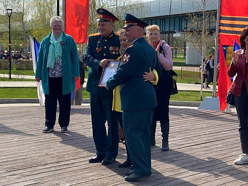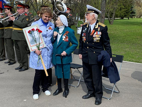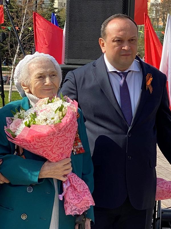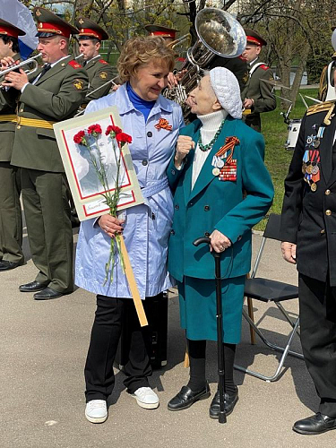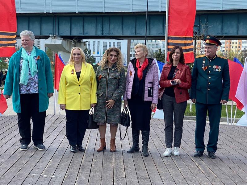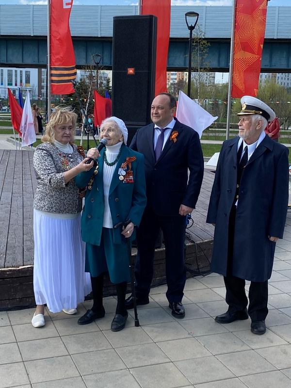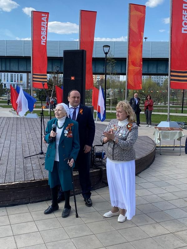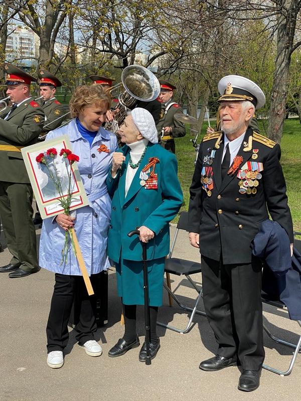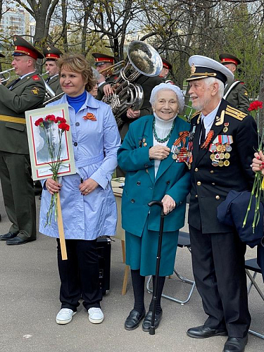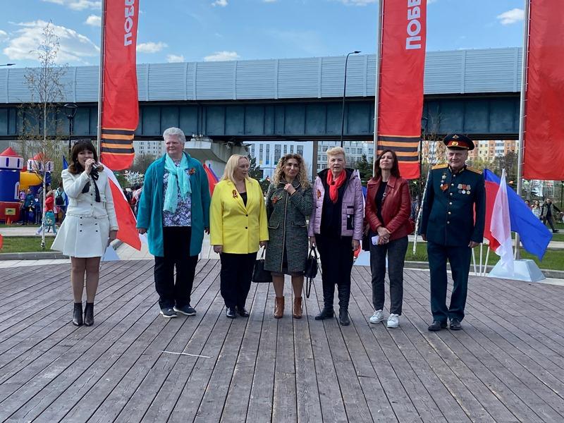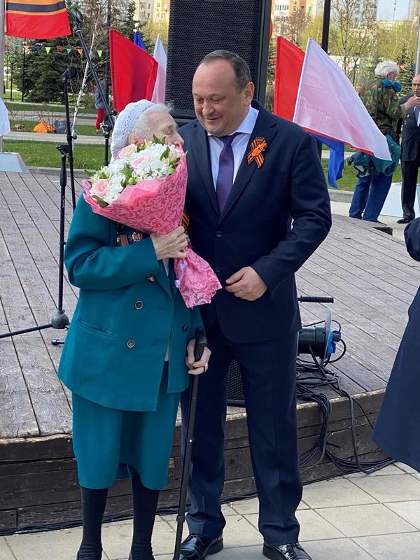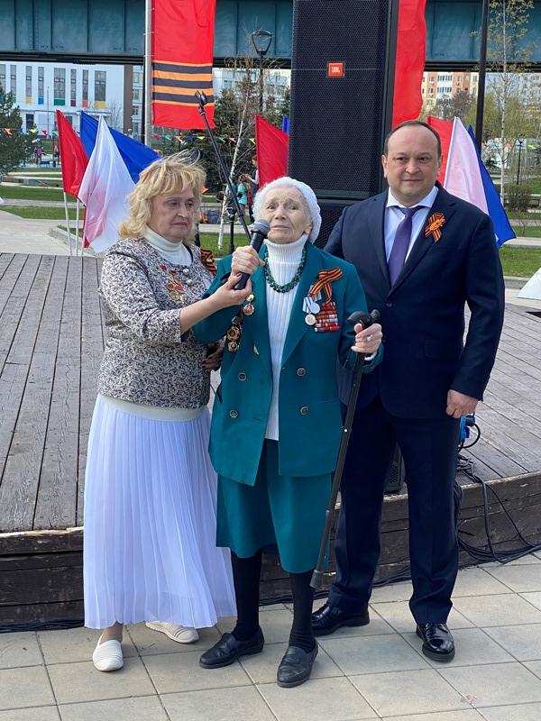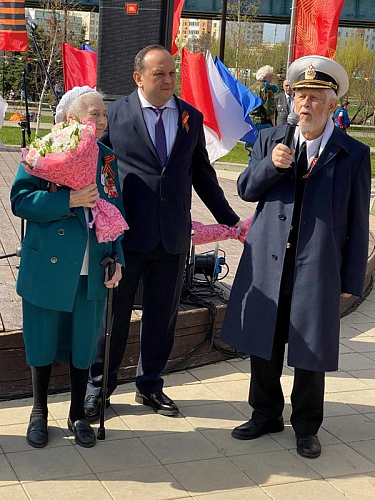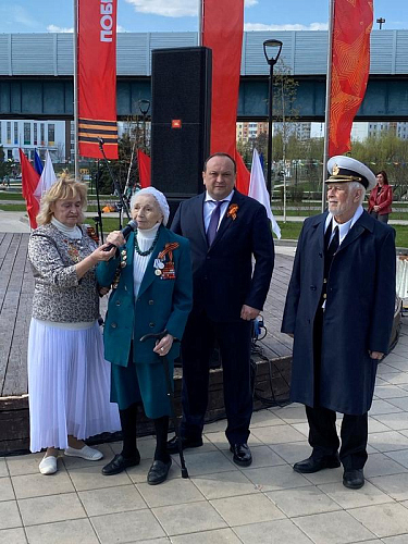 Перед концертом прошла официальная часть, на которой депутаты Муниципального совета вручили самым активным жителям района почетные грамоты и благодарственные письма. От лица жителей района с праздником Победы ветеранов Валентину Владимировну и Рудольфа Леонидовича тепло поздравил Глава Управы Мурад Азадович Бекниязов, который подарил им букеты цветов и ценные подарки.