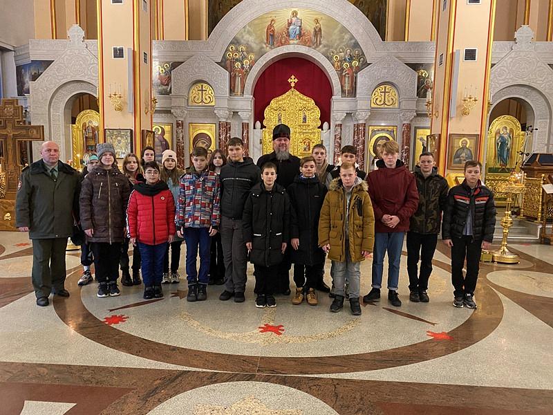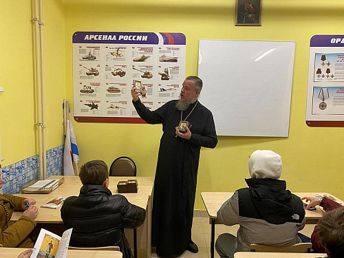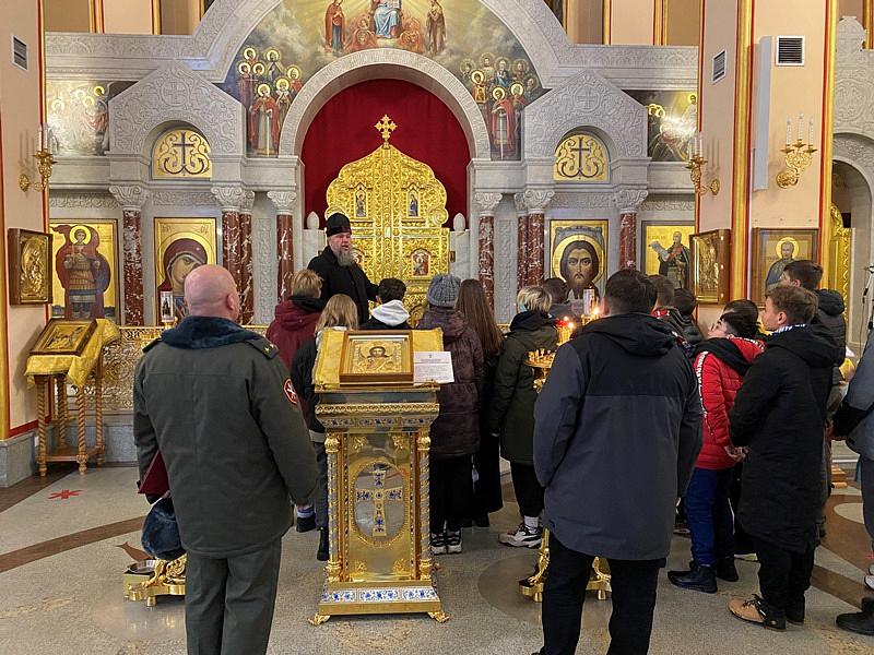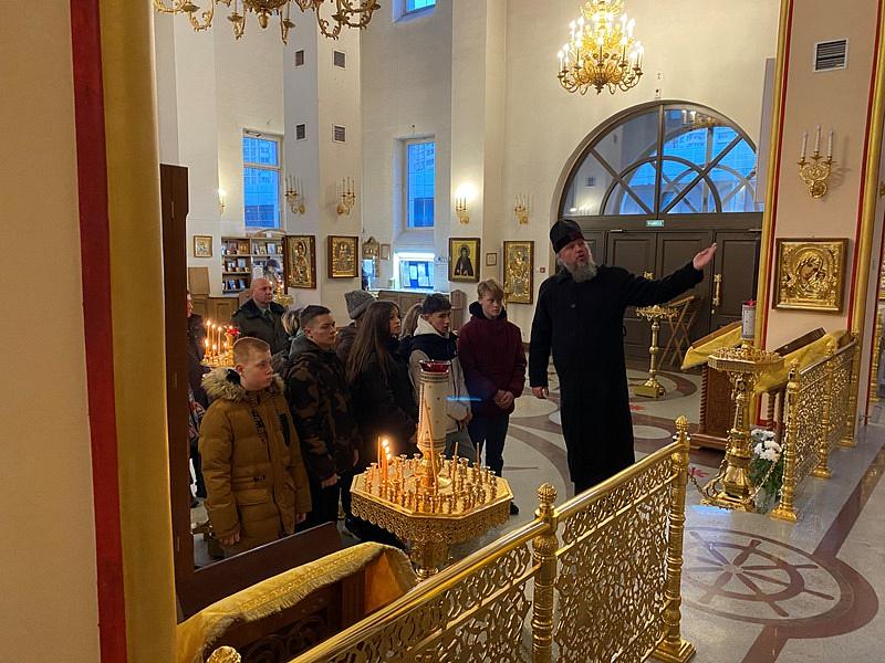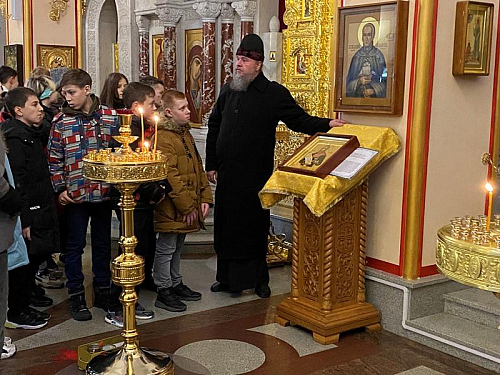 Внутри храма игумен Дамиан рассказал школьникам о тех событиях жизни Небесного покровителя храма - святого адмирала Феодора Ушакова и других святых, которые стали примерами добродетели, преданности, смелости и скромности. Многое из этого ребята уже изучали на уроках Основ Православной культуры, а теперь смогли на практике усвоить и осмыслить.