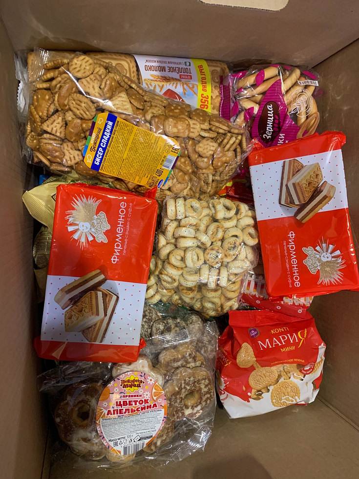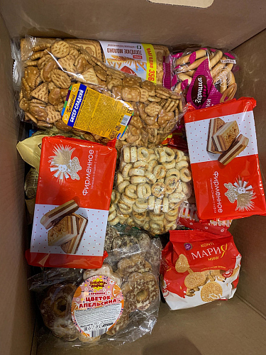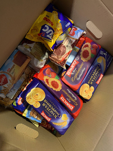 Совместными силами были собраны и упакованы теплые мужские кофты, эластичные бинты, кондитерские изделия, печенья, вафли, сладости, мед, кофе, чай и другие напитки.