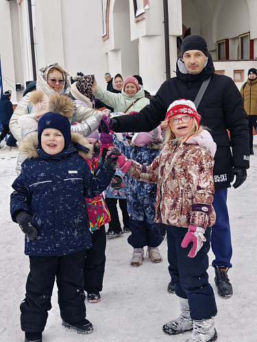 Звучали задорные русские народные песни в исполнении храмовых коллективов, сопровождаемые хороводами, танцами и играми, в которых с удовольствием участвовали и дети, и взрослые. Для малышей было организовано катание на санях, запряженных лошадью.