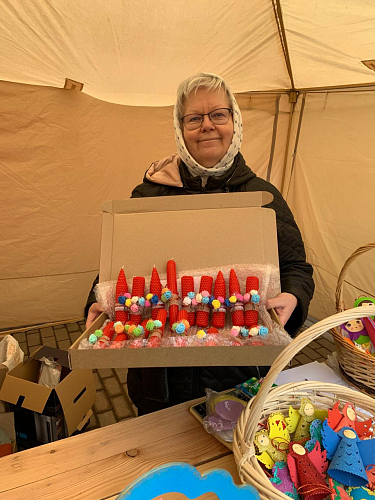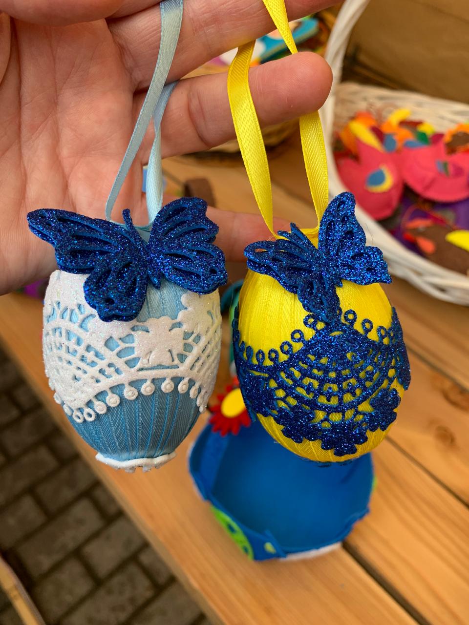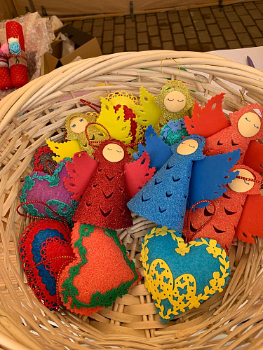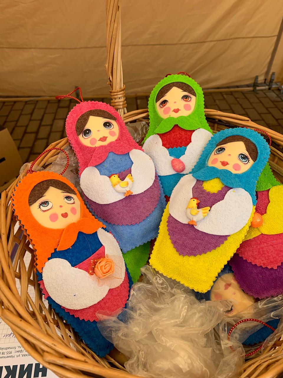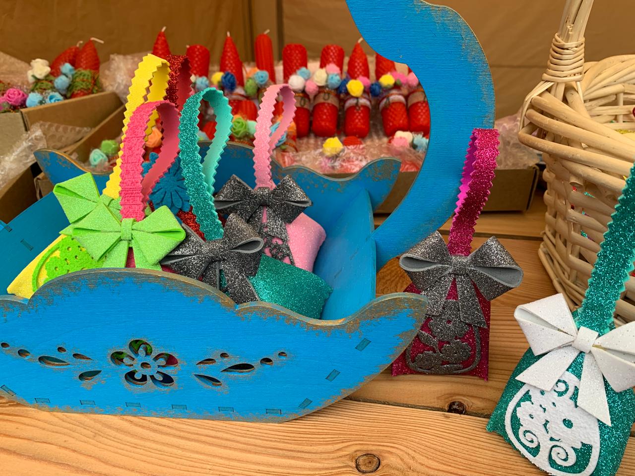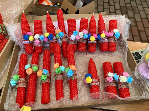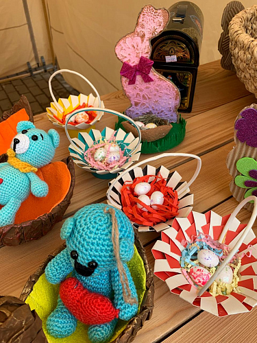 Прихожане и гости храма смогли приобрести себе и своим близким Пасхальные подарки: свечи из листовой вощины с украшением из фоамирана, матрешки, колокольчики с бубенцами, подвески-курочки и петушки, корзинки из фоамирана с украшением ажурными вырубками, корзинки-курочки из папье-маше, яйца-подвески из пенопласта, обвитые атласными лентами и украшенные ажурным декором.