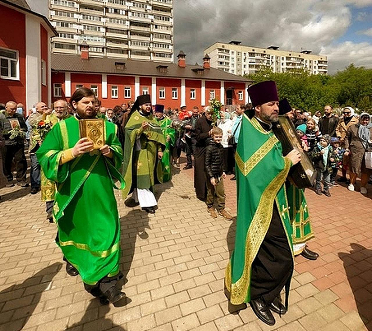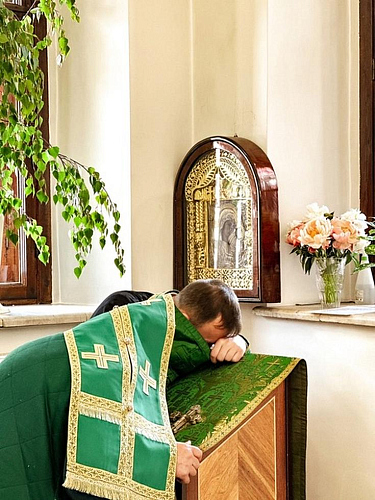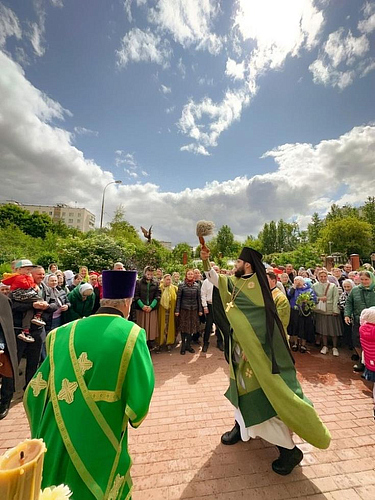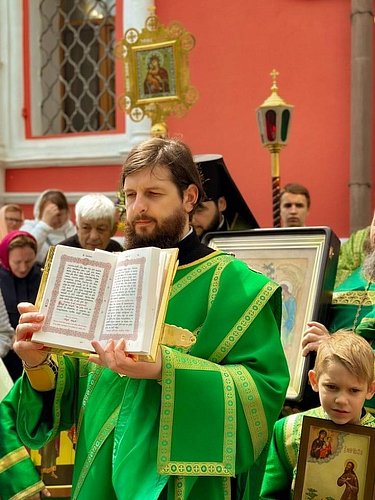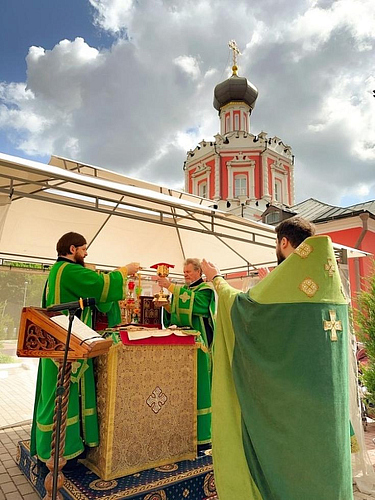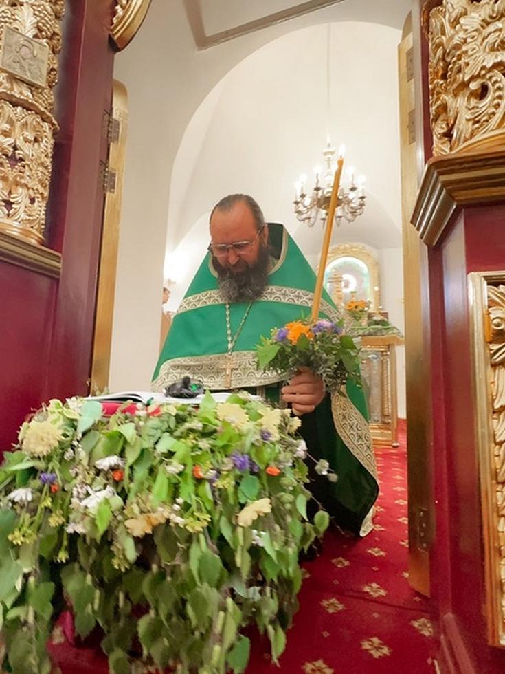 После Литургии был совершен праздничный Крестный ход вокруг храма с чтением Евангелия и окроплением святой водой, затем в благоговейной обстановке была совершена Великая вечерня с чтением коленопреклоненных молитв.