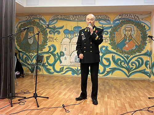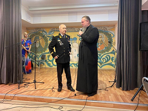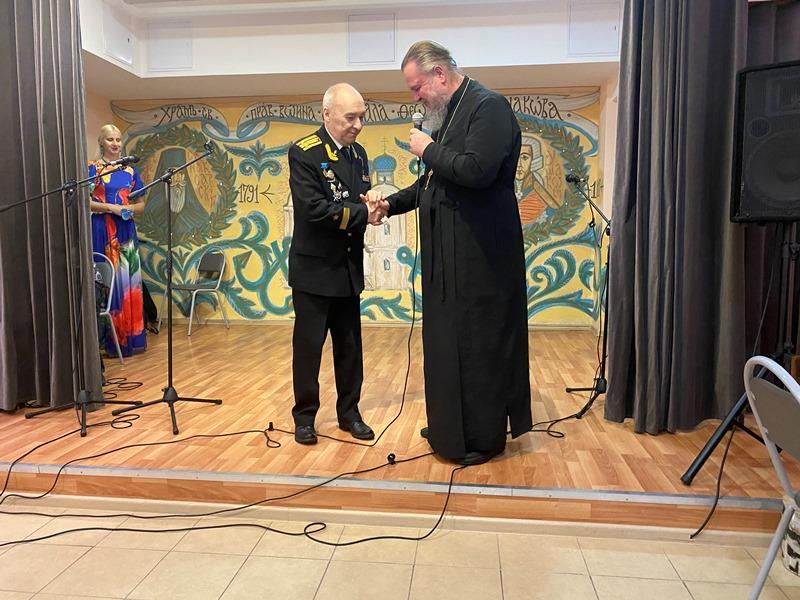 Председатель Совета ветеранов Черноморского флота капитана 1 ранга Анатолий Леонтьевич Егоров поздравил настоятеля и передал в Воскресную школу храма сборник патриотических афиш по Дням воинской славы.