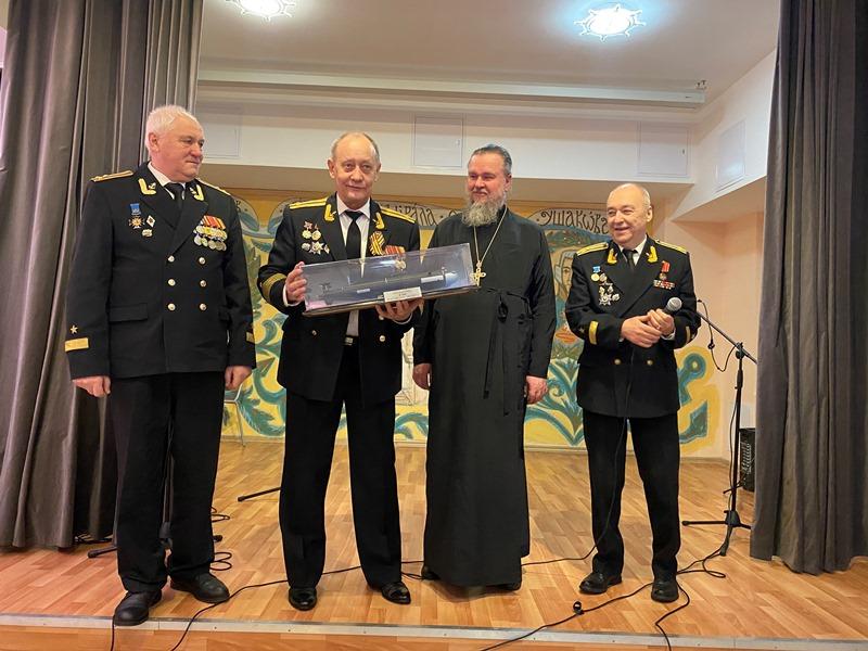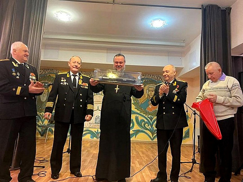 Представители Совета ветеранов Черноморского флота капитан 1-го ранга Александр Дмитриевич Комаров, капитан 1-го ранга Алексей Алексеевич Иноземцев и капитан 2-го ранга Андрей Георгиевич Попов поздравили настоятеля с 10-летием Подворья и подарили храму макет подворной лодки, на которой они служили в свое время.