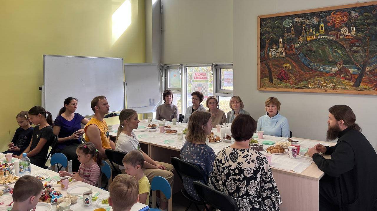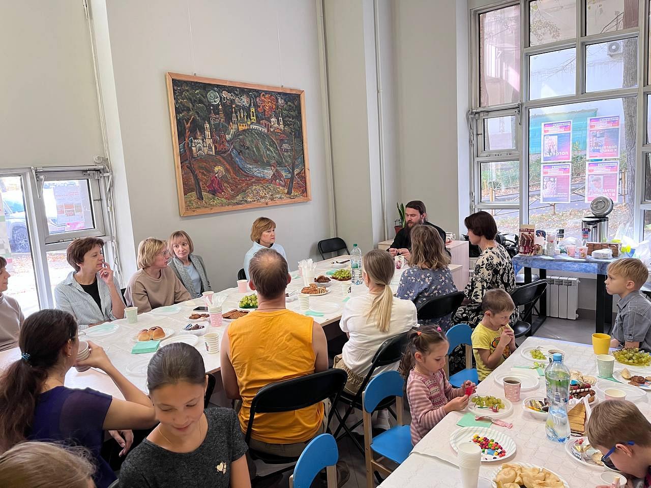 После совместной молитвы ученики детской и взрослой групп дружной компанией встретились на чаепитии, организованном по случаю начала занятий. Возглавил встречу настоятель храма иерей Николай Алешин. Взрослые и дети были искренне рады возможности вновь встретиться, пообщаться и совместно обсудить планы на предстоящий учебный год.