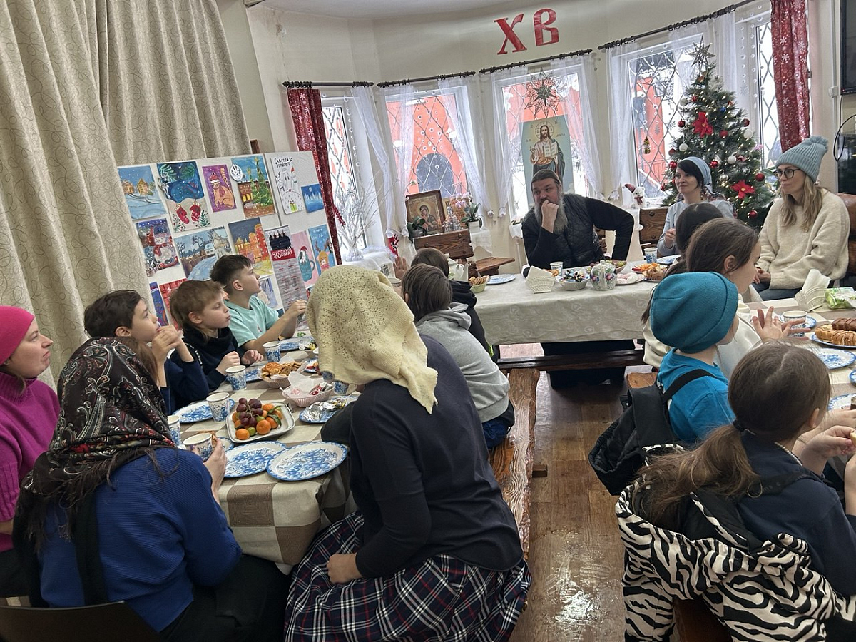 Завершилась встреча чаепитием в Воскресной школе, за трапезой дети подкрепились пирогами и сладким угощением, поделились впечатлениями и получили в подарок книги и сладости.
