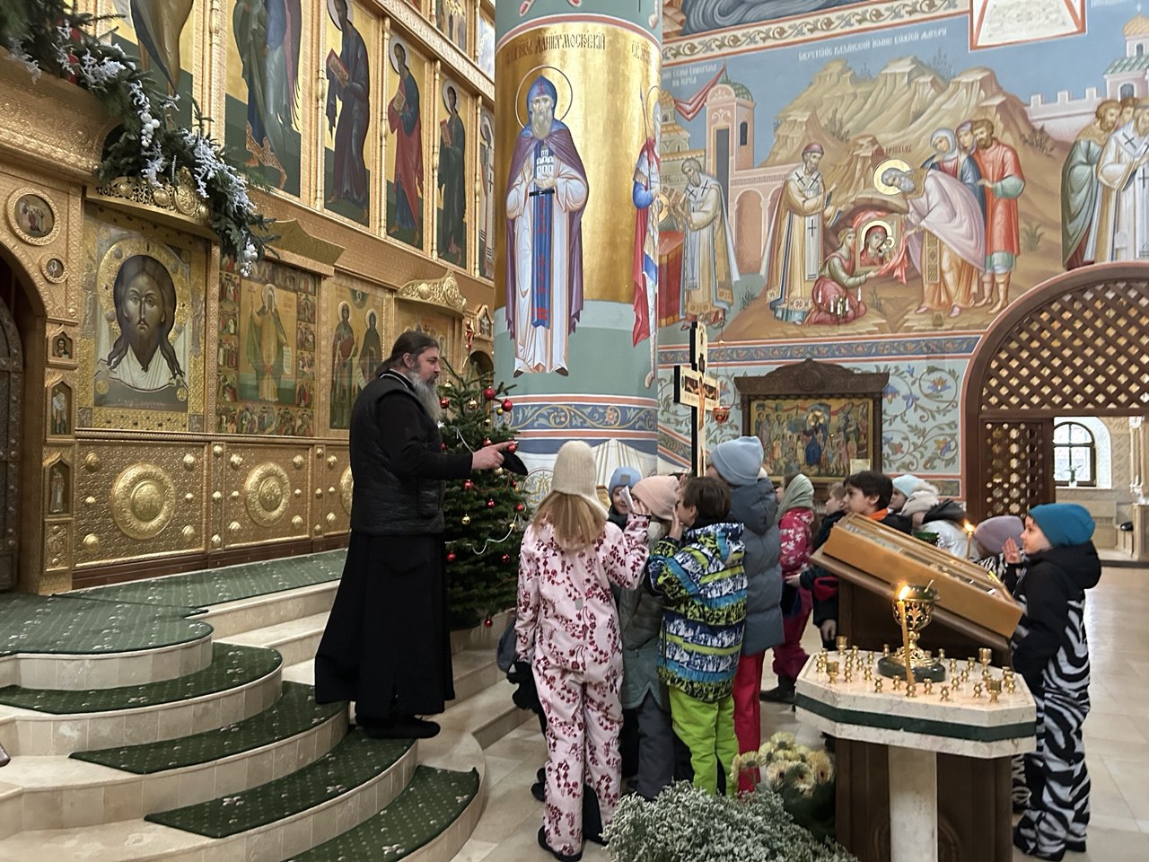 Иерей Иоанн рассказал историю Рождества Христова, затем дети осмотрели росписи и фрески крестильного придела в честь преподобного Сергия Радонежского, после чего в основном храме познакомились с историей жития Священномученика Ермогена.
