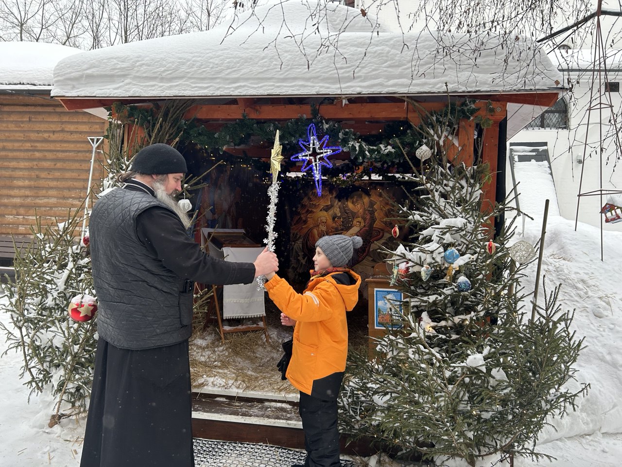 Затем дети с большим интересом осмотрели Рождественский вертеп, установленный на территории подворья, после чего экскурсия продолжилась в основном храме в честь Священномученика Ермогена, Патриарха Московского и всея Руси.