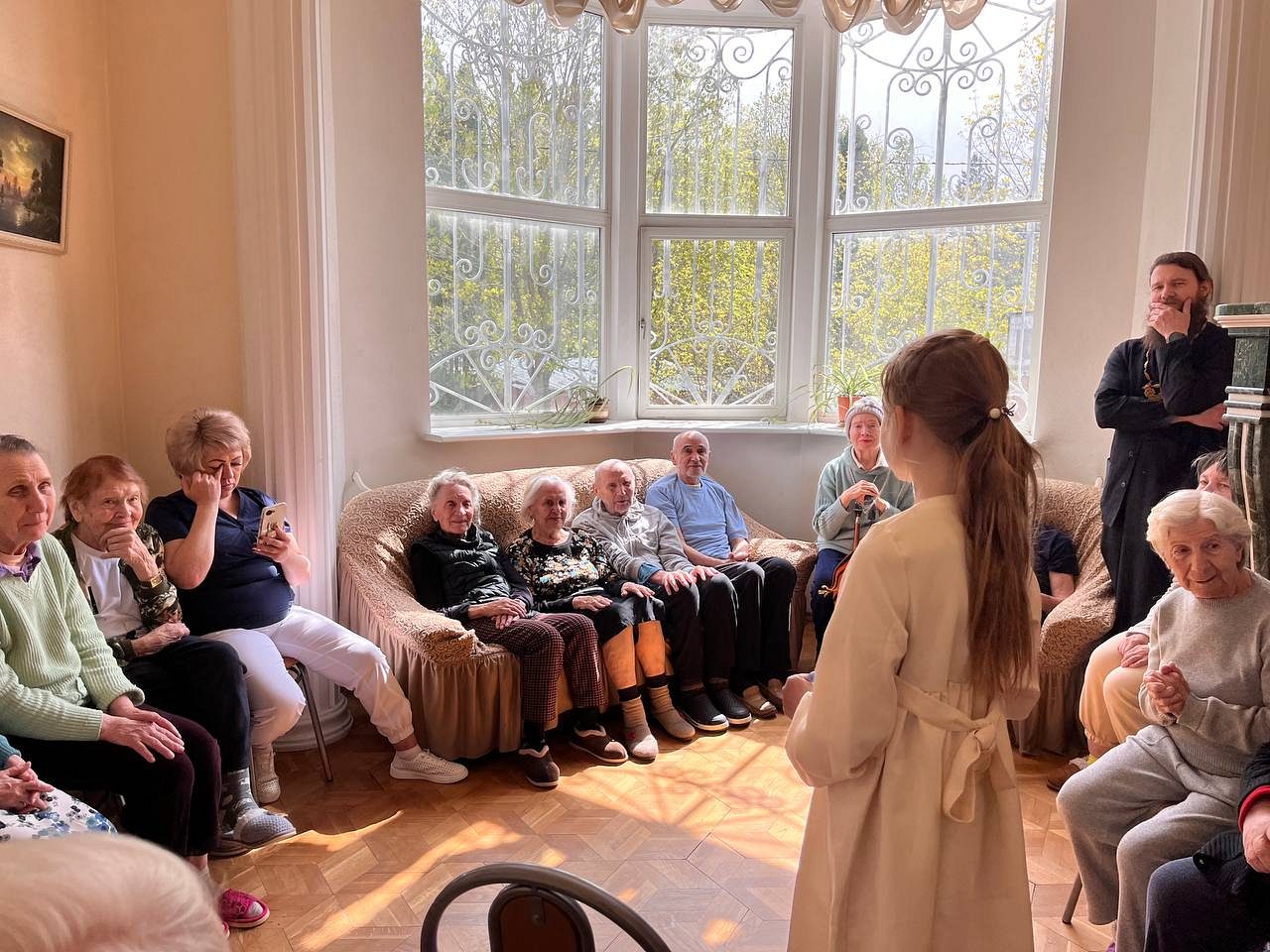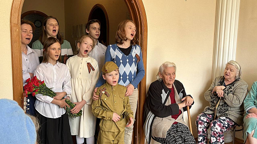 с задушевными песнями из кинофильмов и стихами военных лет. Дедушки, бабушки с большим удовольствием слушали чудесные голоса, исполняющие такие любимые ими песни, и подпевали сами. Благодаря всеобщему энтузиазму для проживающих получился настоящий яркий праздник с угощениями.