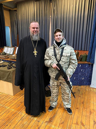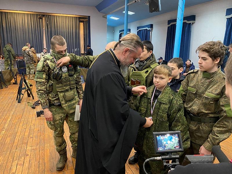Организаторами спортивно-патриотического мероприятия был приглашен настоятель храма святого праведного воина Феодора Ушакова в Южном Бутове игумен Дамиан (Залетов), член штаба Юнармии ЮЗАО г. Москвы.