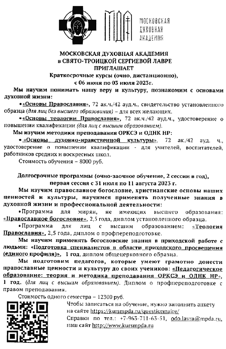 Отдел дополнительного образования Московской Духовной Академии в период с 6 июня по 3 июля 2023 г. осуществляет обучение в рамках краткосрочных курсов, а также предлагает обучение в долгосрочных программах.