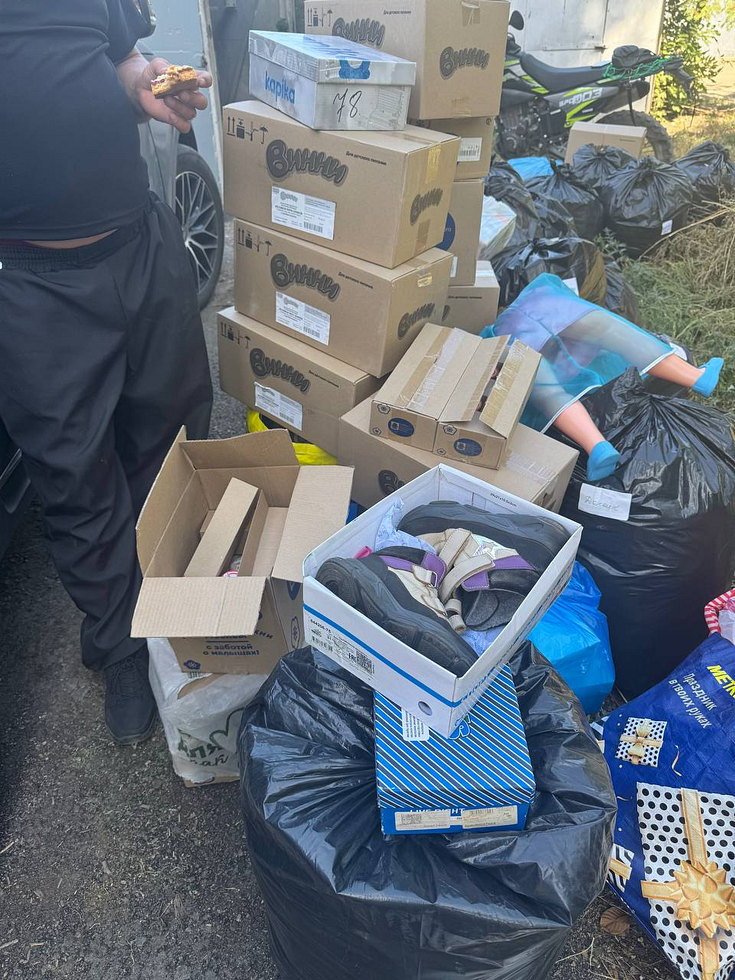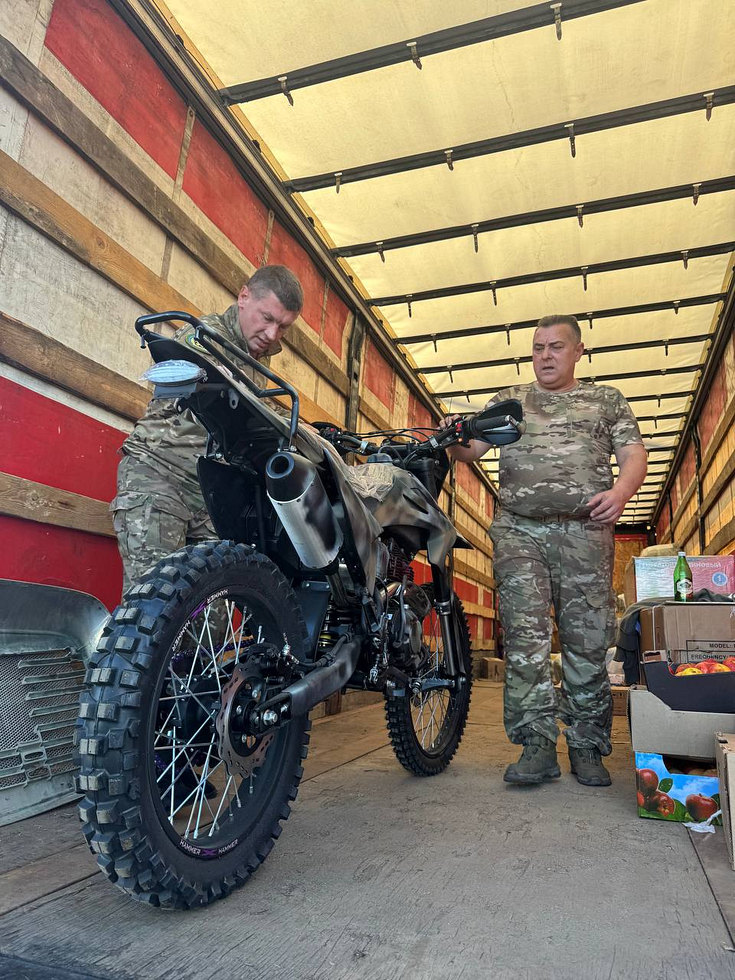 23 августа под Старобельском Луганской области волонтеров встретили военные. Ребятам передали автомобиль Газель и мотоцикл, 20 км провода полёвки, Мавик-3, маскировочные сети, сухой душ, влажные салфетки, сухой суп, печенье, носки, белье.