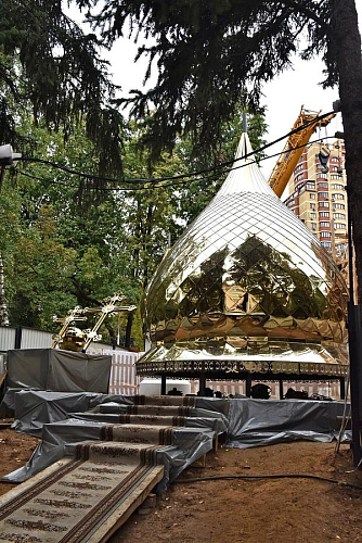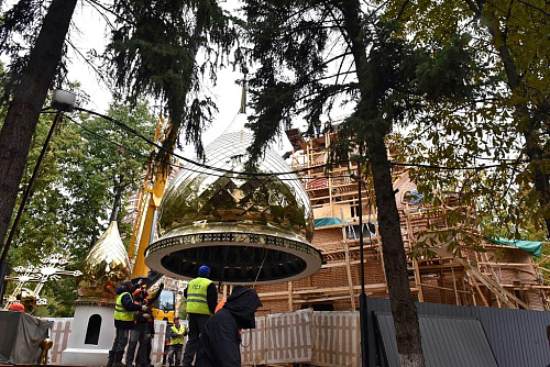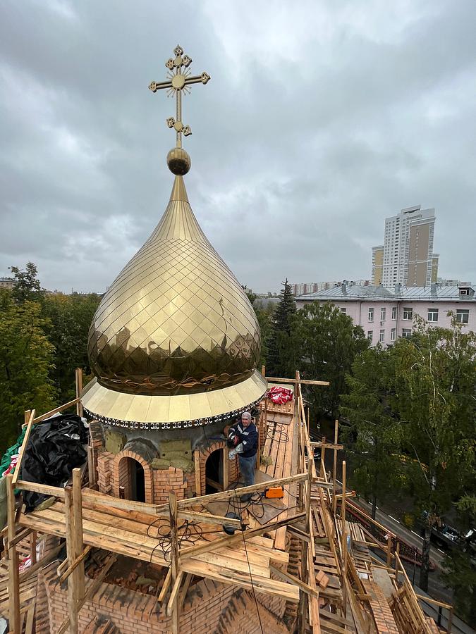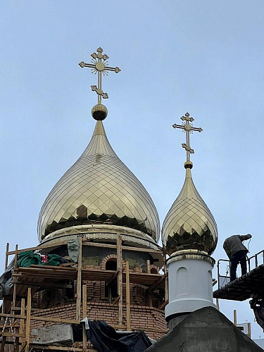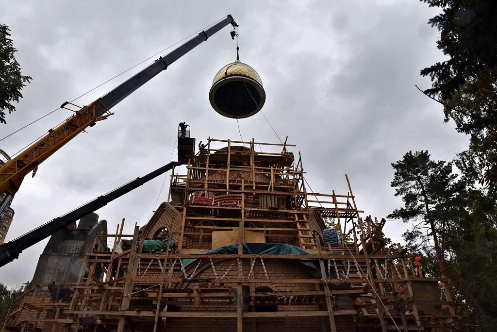 Купола храма покрыты нитридом титана «под золото». Благодаря такому напылению цвет устойчив к любым погодным воздействиям и, конечно же, не будет ржаветь. Общий вес куполов составил около 5 тонн: 3,5 тонны весит большой купол и 1,5 тонны вес маленького. Высота конструкций 8,5 метров и 5,8 метров соответственно. Все собравшиеся отметили, что храм на территории больницы возводится быстрыми темпами: специалисты уже приступили к внутренней отделке здания.