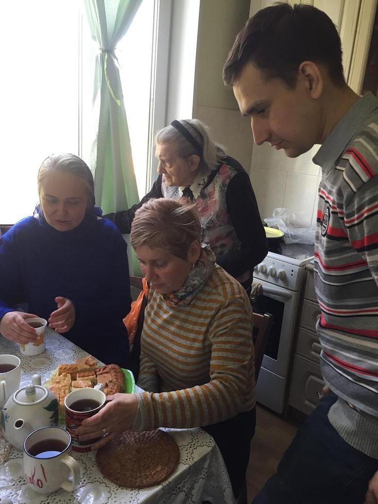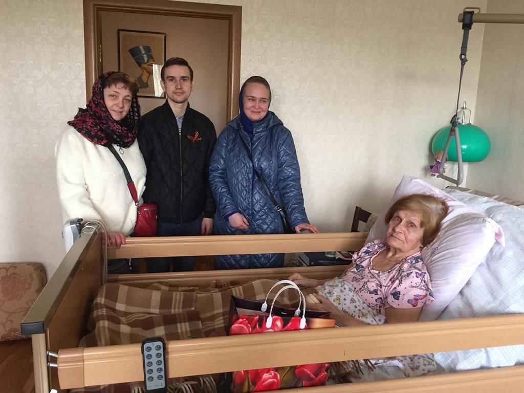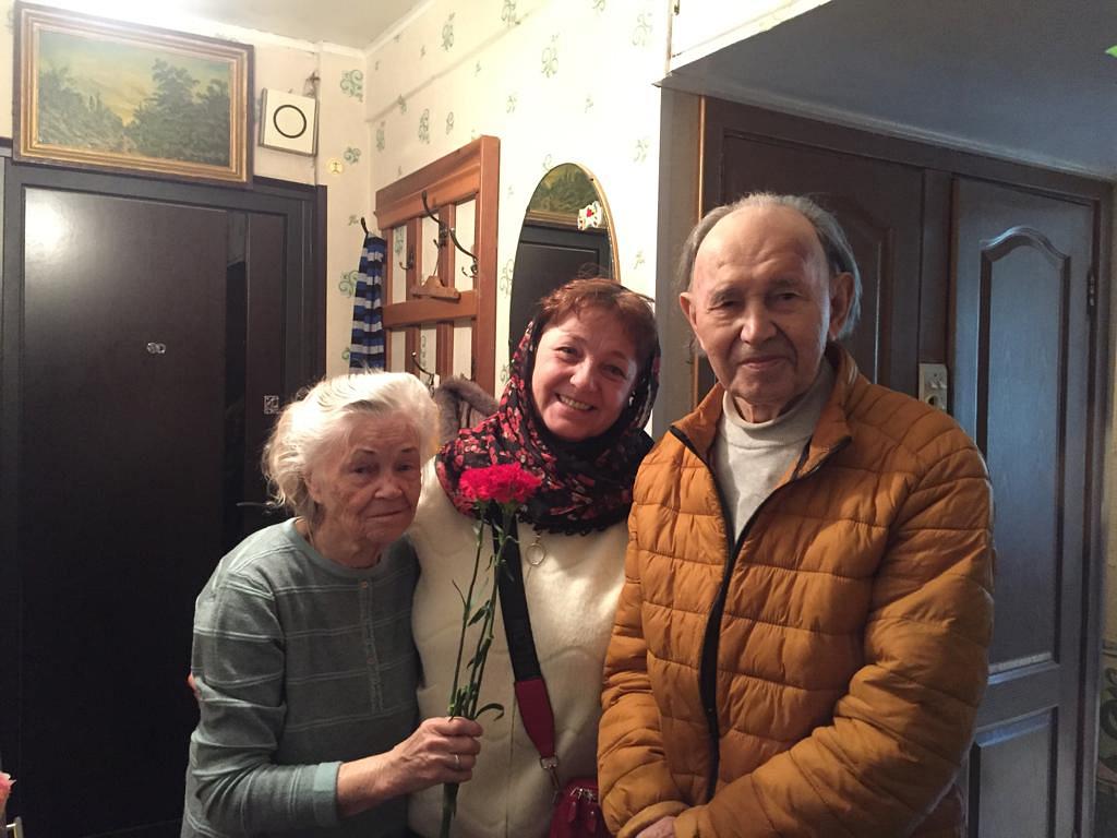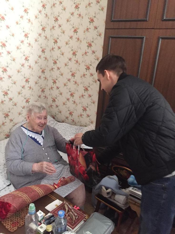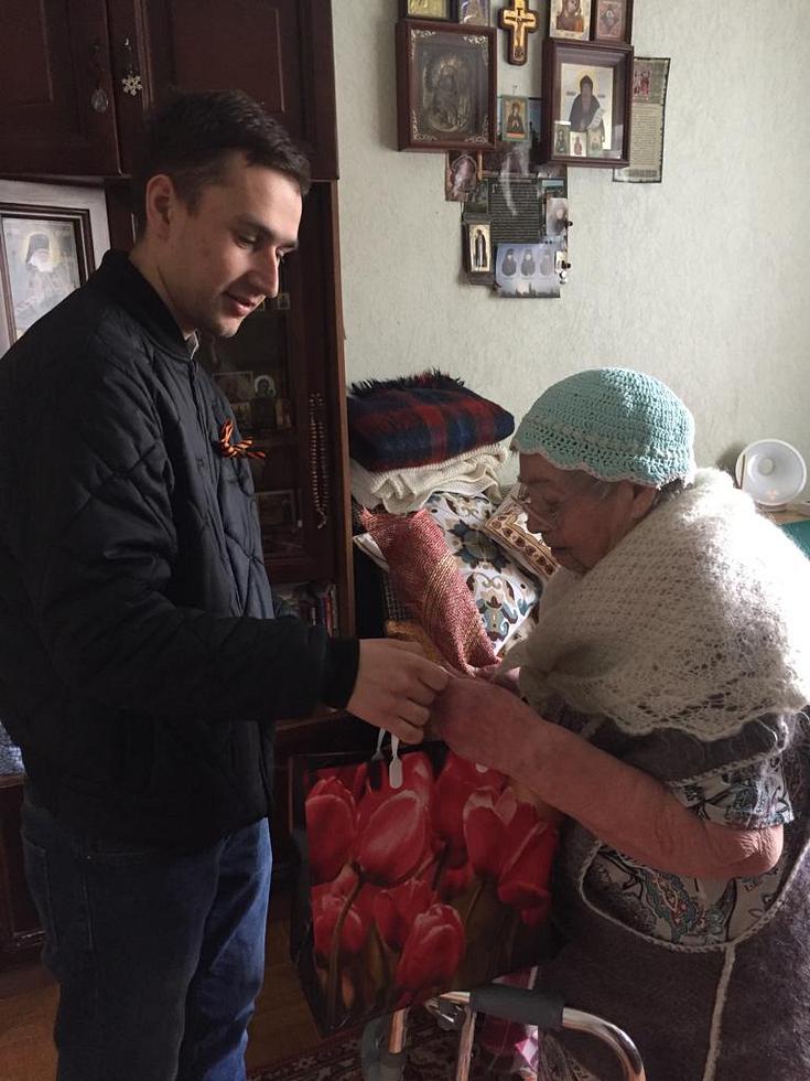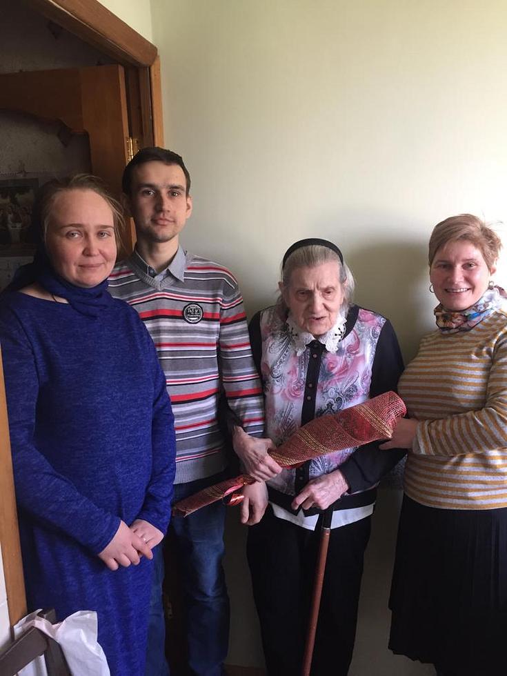 Добровольцы вначале поздравили ветеранов с Праздником Пасхи, передали артос, просфоры и пропели тропарь Пасхи, затем вручили подарки ко Дню Победы (цветы и продуктовые наборы).