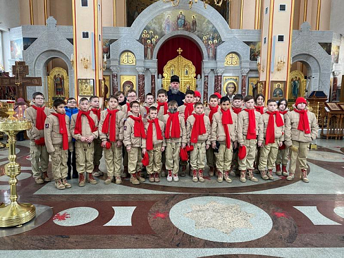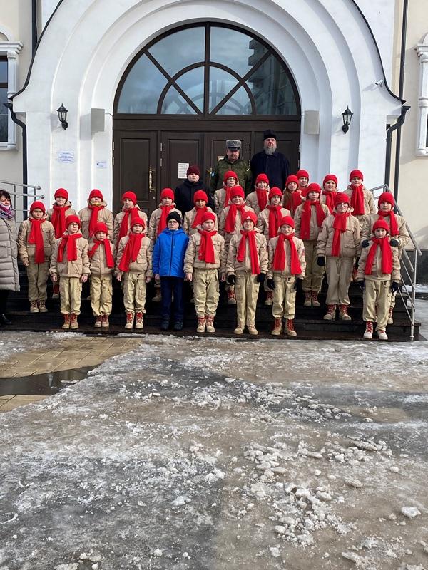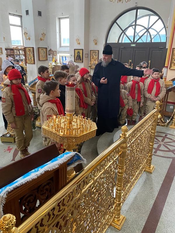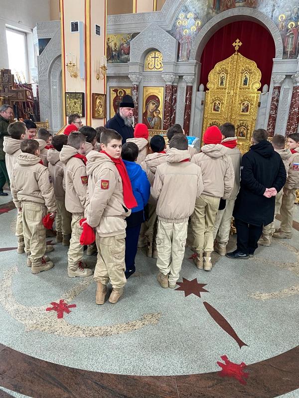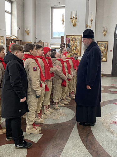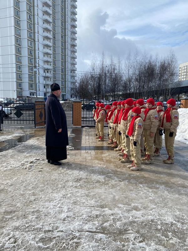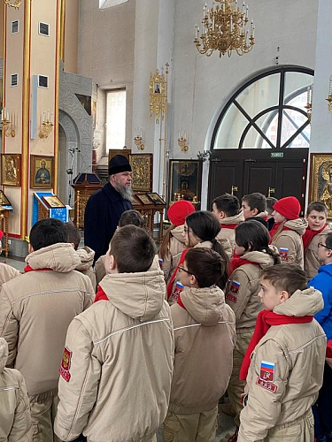 При входе в храм ребят встретил настоятель, член штаба Юнармии ЮЗАО г. Москвы, игумен Дамиан (Залетов), который рассказал о строительстве на этом месте храма в честь святого праведного воина Феодора Ушакова.