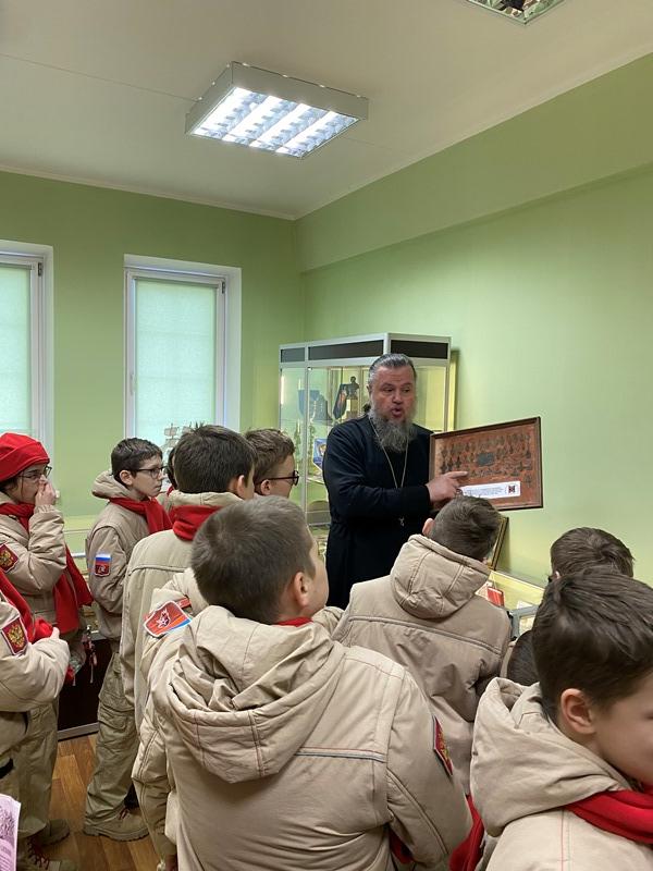 Юнармейцы посетили церковно-археологический музей храма. Игумен Дамиан показал им особый экспонат. Этот уникальный экспонат передали в новый музей представители Московского отделения Российского военно-исторического общества и поисковиков Военно-патриотического объединения «Нарский рубеж».