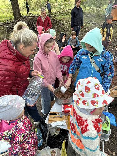 Затем участники прошли через поселок к реке Истра в лесной массив под названием Троицкий бор, где с помощью сопровождающих родителей установили на поляне среди сосен палаточный лагерь.