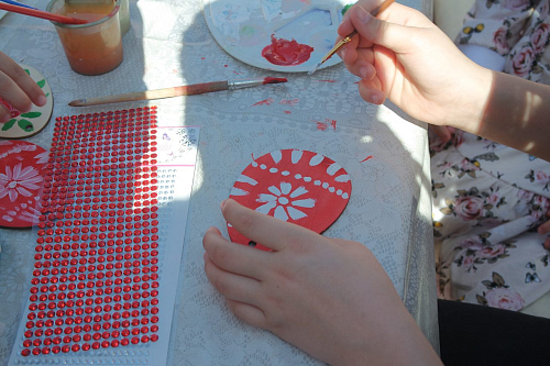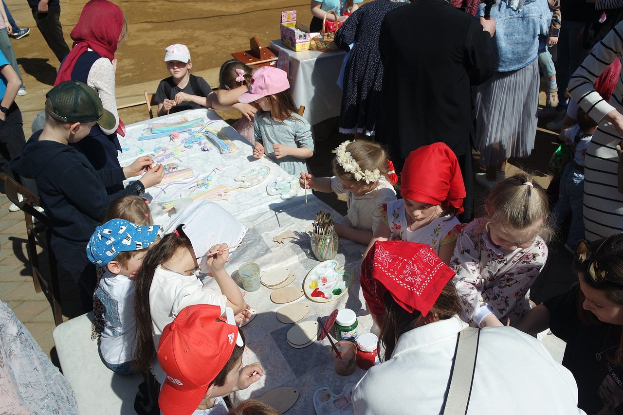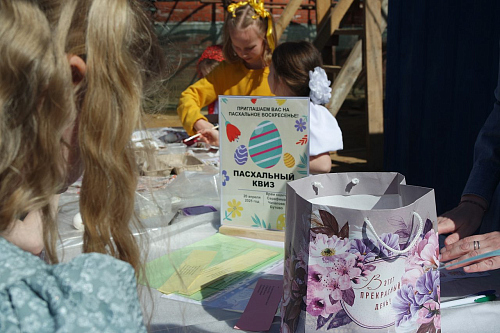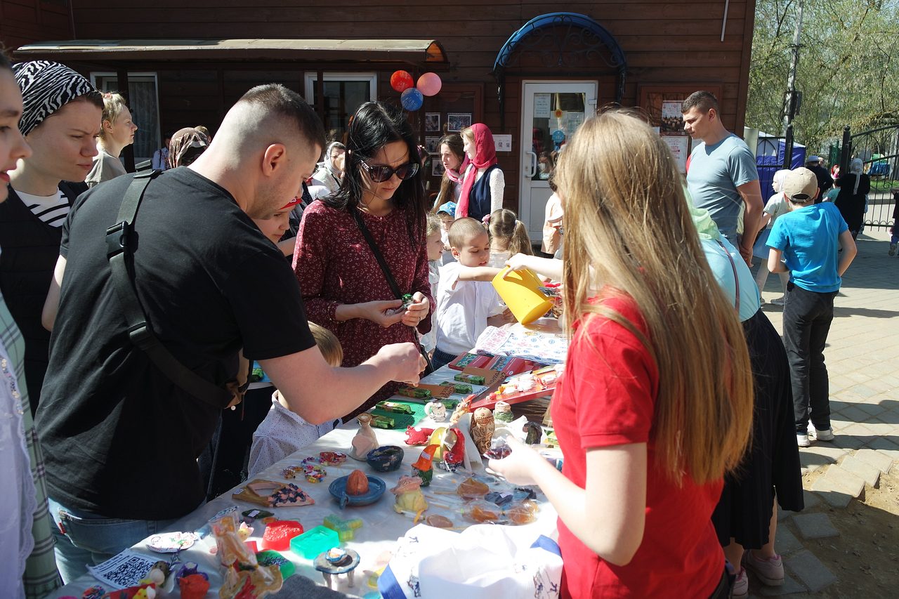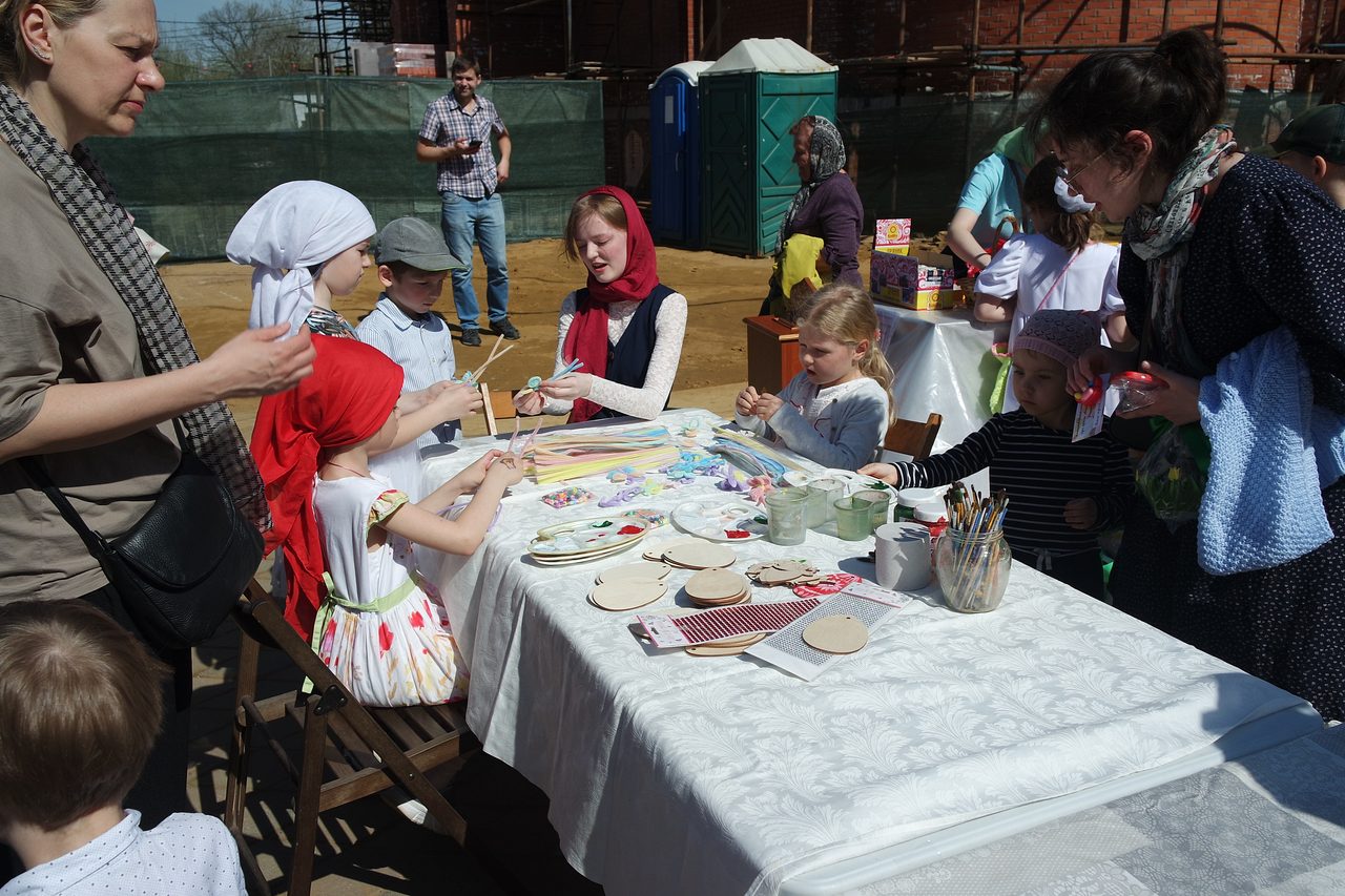 Затем на территории строящегося храма прошла Пасхальная ярмарка,а также мастер-класс для детей по изготовлению украшений, пасхальных сувениров и различных поделок.