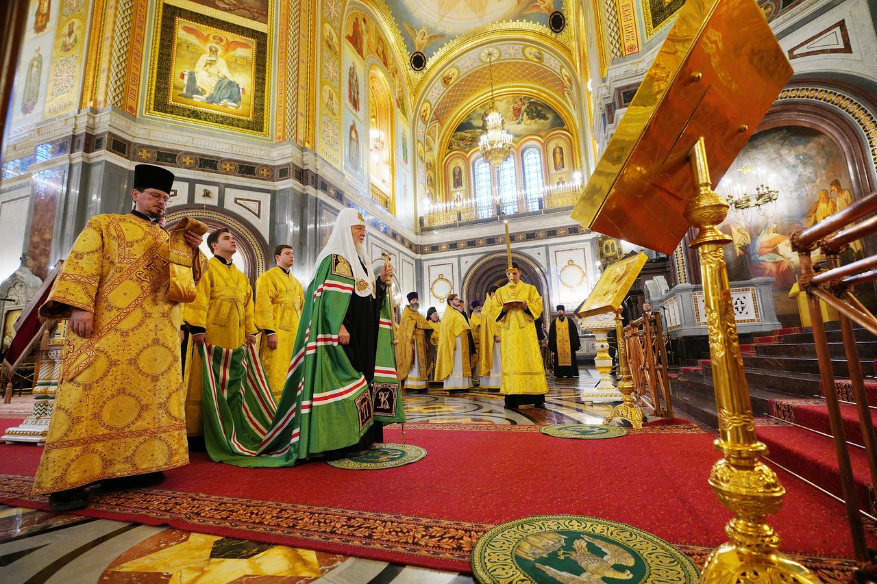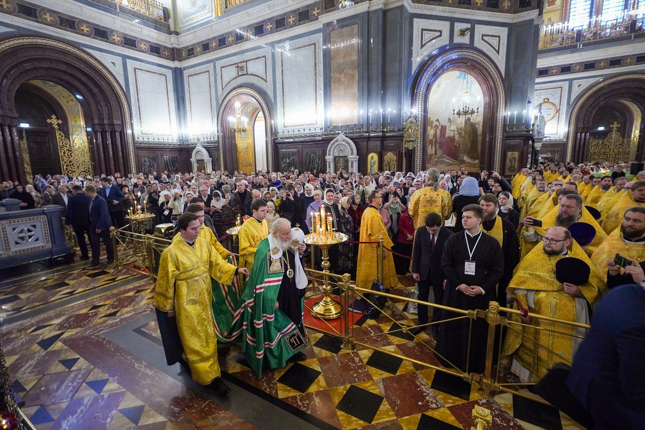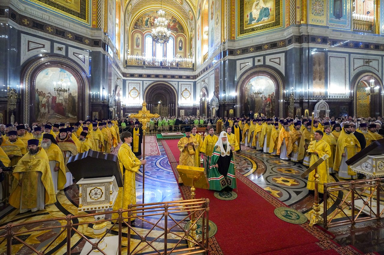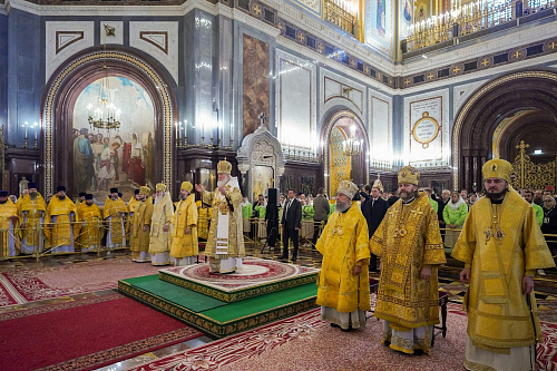 За Литургией Его Святейшеству сослужили: митрополит Воскресенский Григорий, управляющий делами Московской Патриархии, первый викарий Патриарха Московского и всея Руси по г. Москве; митрополит Саранский и Мордовский Зиновий; архиепископ Кокшетауский и Акмолинский Варсонофий; архиепископ Одинцовский и Красногорский Фома, руководитель Административного секретариата Московской Патриархии; епископ Аргентинский и Южноамериканский Леонид; епископ Раменский Алексий, личный секретарь Святейшего Патриарха Кирилла; протоиерей Михаил Рязанцев, ключарь Храма Христа Спасителя; протоиерей Михаил Потокин, председатель Синодального отдела по церковной благотворительности и социальному служению; протоиерей Андрей Марущак, клирик Храма Христа Спасителя; сотрудники Синодального отдела по церковной благотворительности и социальному служению в священном сане, духовенство г. Москвы.