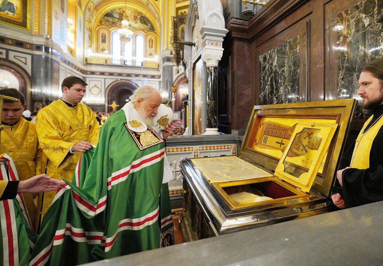 Перед началом богослужения Предстоятель Русской Православной Церкви поклонился честным мощам святителя Филарета, митрополита Московского.