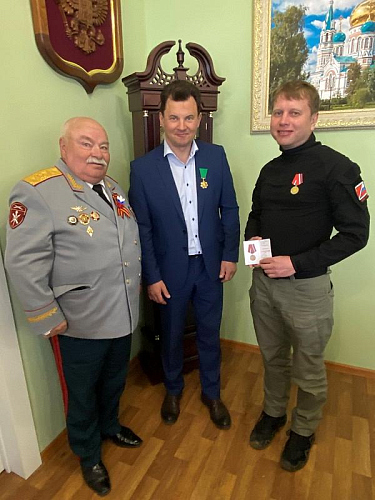 Генерал-майор Николай Николаевич Тутрин вручил Михаилу Алексеевичу Сизьмину медаль Совета ветеранов боевых действий в память 350-летия императора Петра Великого, а Главе Муниципального округа Южное Бутово Павлу Викторовичу Голубцову медаль за добросовестный труд.