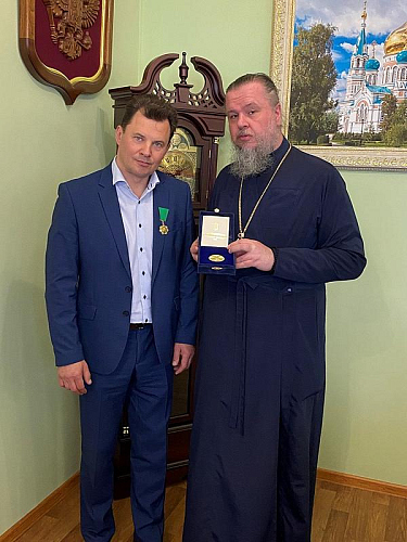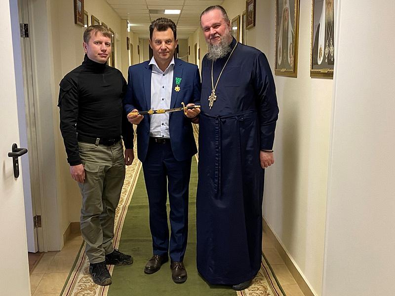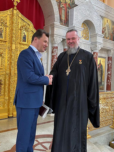 Игумен Дамиан тепло поздравил Героя России с высокой церковной наградой и сердечно поблагодарил его за труды, внимаю к храму Божиему, заботу о жителях района и высокую патриотическую позицию. Награжденный в свою очередь тепло поблагодарил Святейшего Патриарха Кирилла за высокую честь и внимание.
