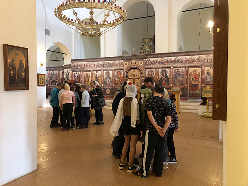 Войдя в храм, пятиклассники освежили свои знания благодаря экскурсии преподавателя воскресной школы Дениса Андреевича Кузнецова.