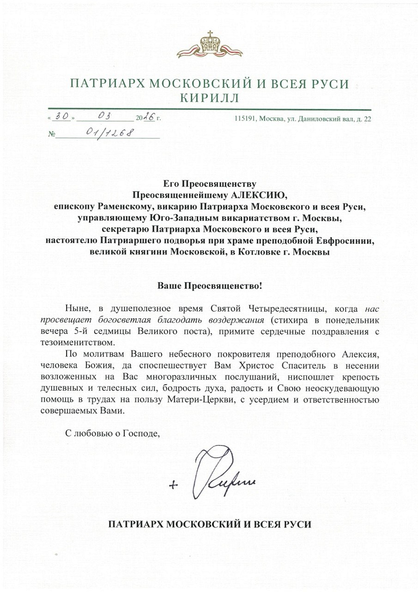 Поздравление Святейшего Патриарха Кирилла епископу Раменскому Алексию с днем тезоименитства.