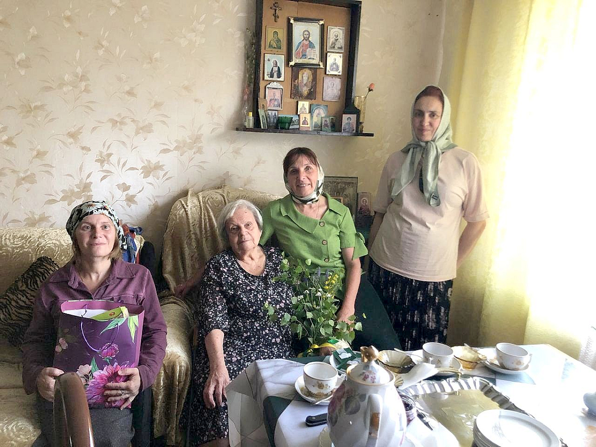 Добровольцы поздравили их с праздником, пропели тропарь Троицы и вручили продуктовые наборы, букетики березы.