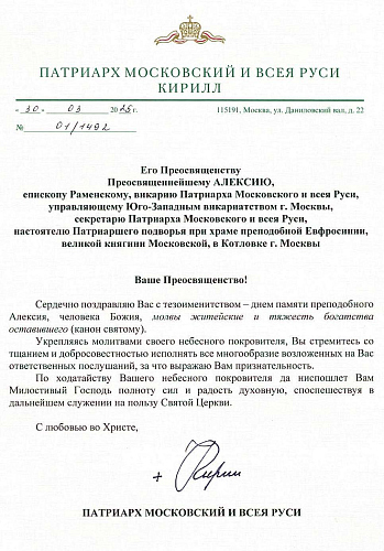 Главная/Новости/Новости Викариатства/ Поздравление Святейшего Патриарха Моcковского и всея Руси Кирилла с днем тезоименитства епископа Раменского Алексия