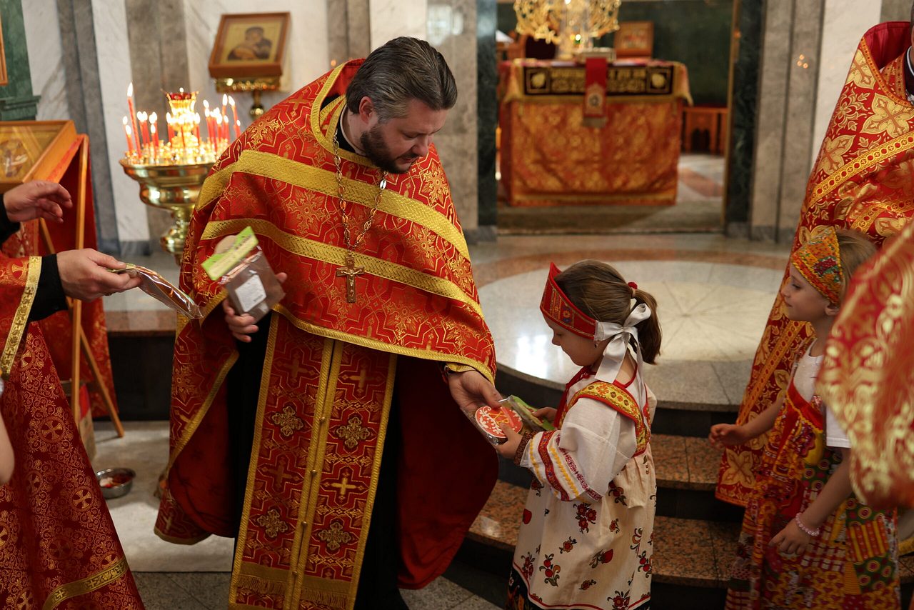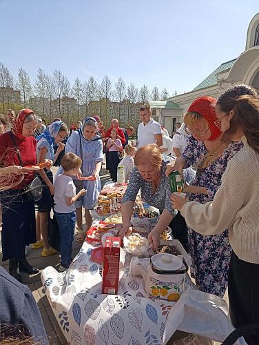 На улице были накрыты столы с угощением для всех пришедших разделить радость о Воскресшем Господе, а детям, молившимся на пасхальных Литургиях, были вручены праздничные пряники.