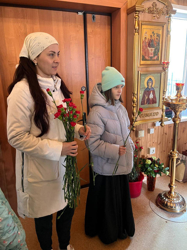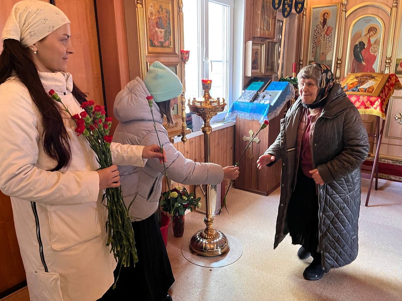 Несмотря на холодную снежную погоду на праздник собрались все прихожане, присутствующие в этот день храме. Люди согревали друг друга радостью и теплыми улыбками. Волонтеры социальной службы храма поздравили присутствующих гвоздиками.
