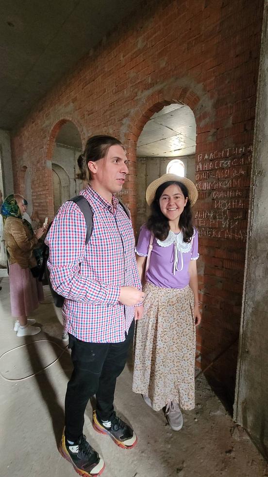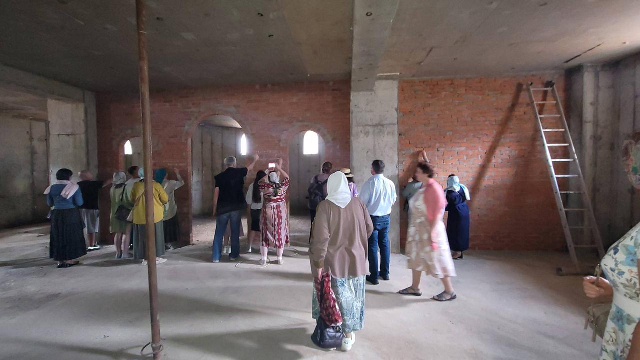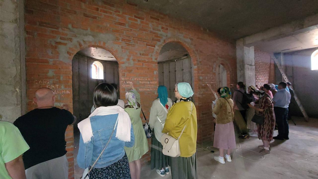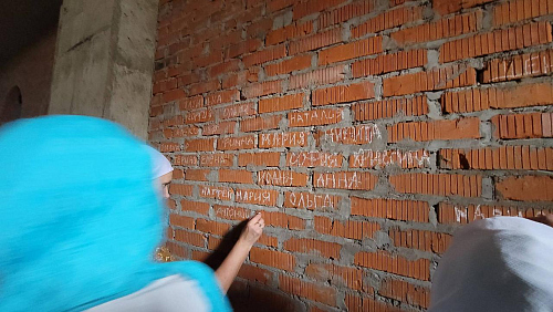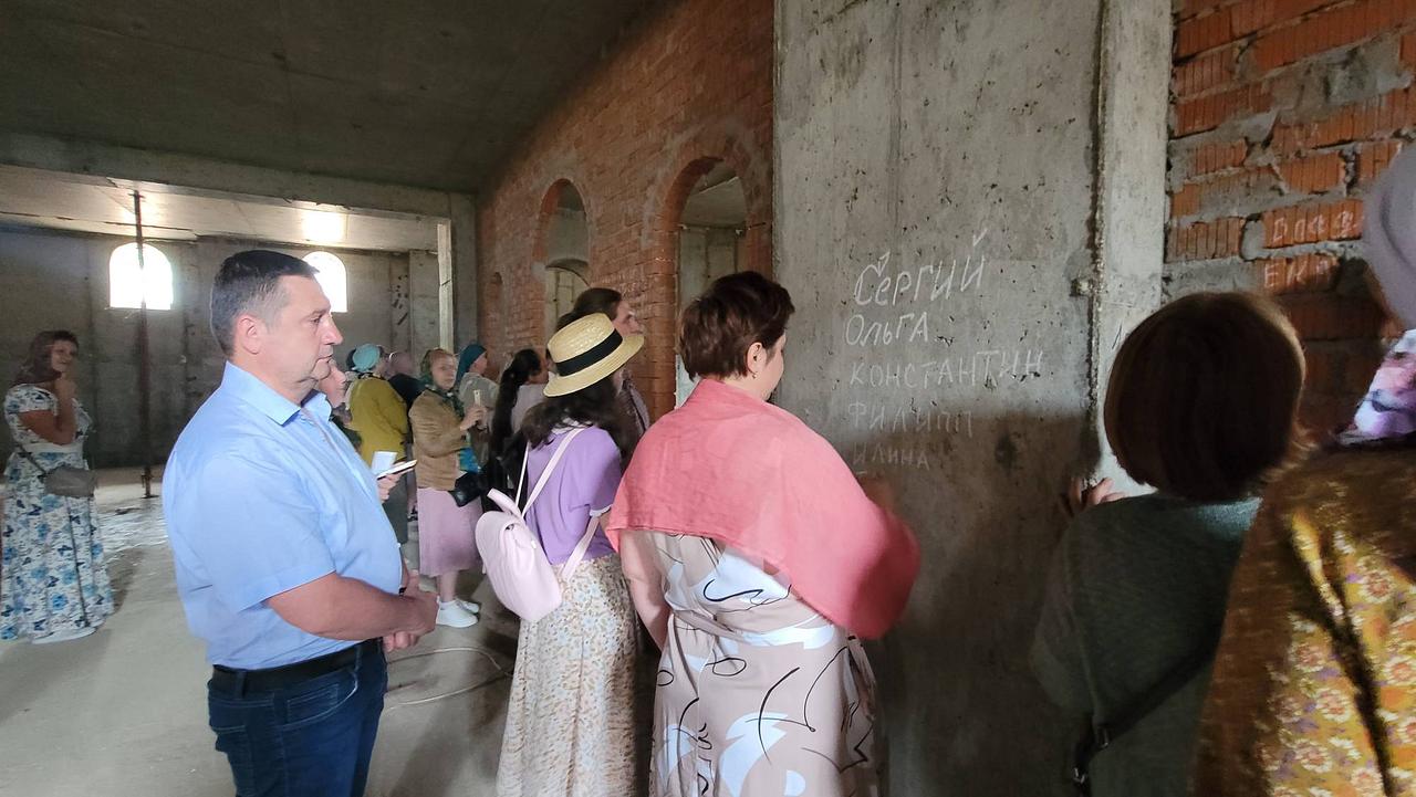Далее настоятель храма раздал всем присутствующим белые мелки и пригласил посетить цокольный этаж строящегося храма сщмч. Серафима, там каждый смог написать на кирпичной кладке алтарной стены свои имена и имена сродников, для поминовения.