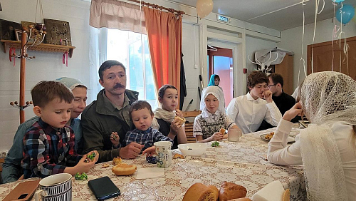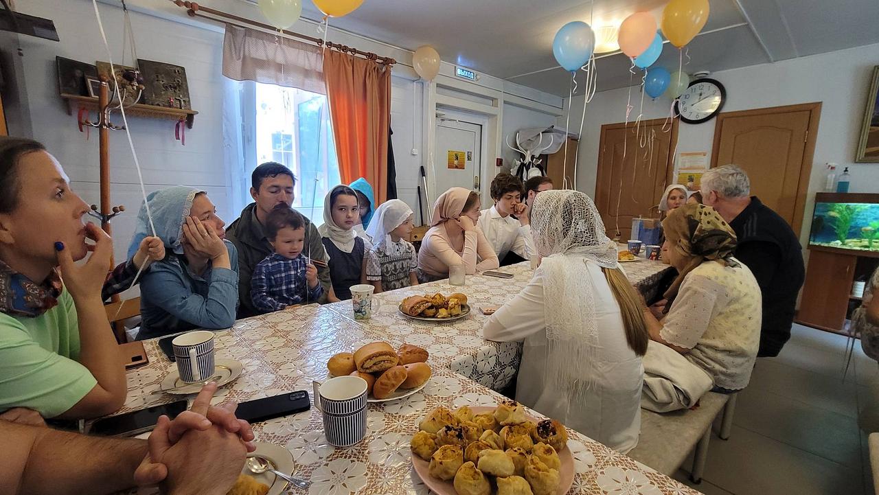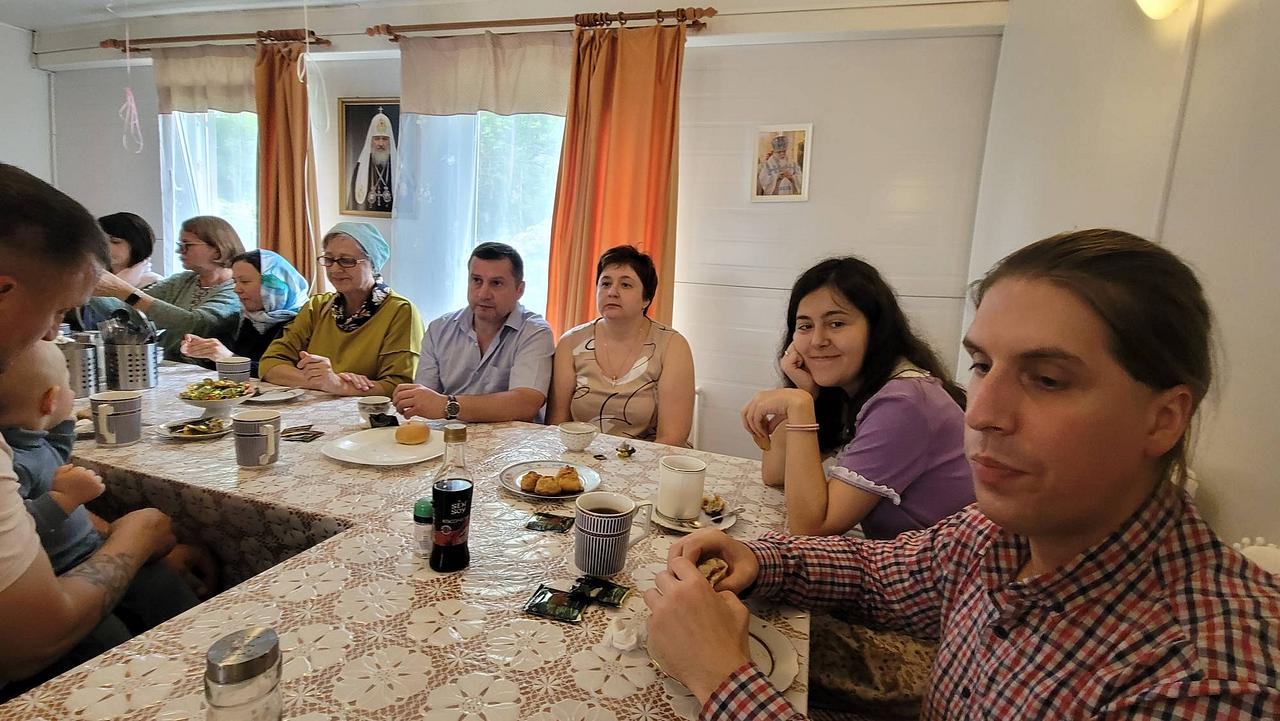 Затем в трапезной храма состоялось праздничное чаепитие с настоятелем храма. На чаепитие с прихожанами храма, молодежным активом, с многодетными семьями и парами готовящимися вступить в брак пообщался иерей Максим Глухих, рассказав о семье, верности и любви и о православном понимании этих добродетелей.