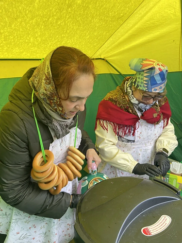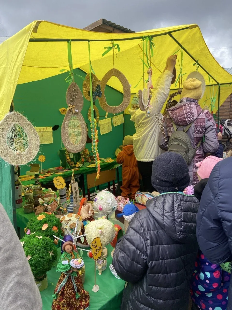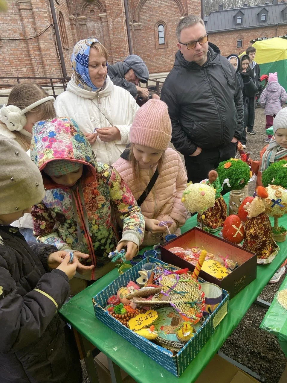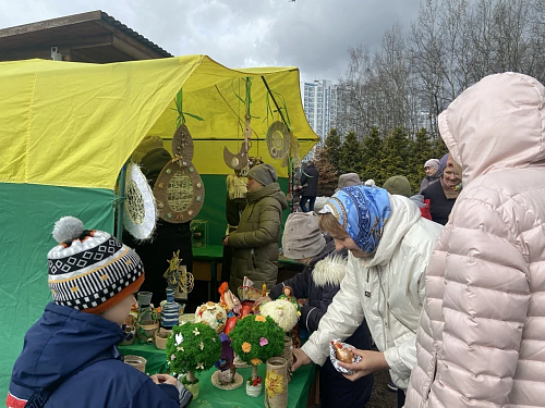 После поздней Литургии прихожане могли приобрести пасхальные сувениры, которые были специально изготовлены к ярмарке добровольцами социальной службы, а также участниками кружка рукоделия и детьми воскресной школы под руководством преподавателя Елены Александровны. Прихожане также смогли угоститься горячим чаем с постными сладостями.