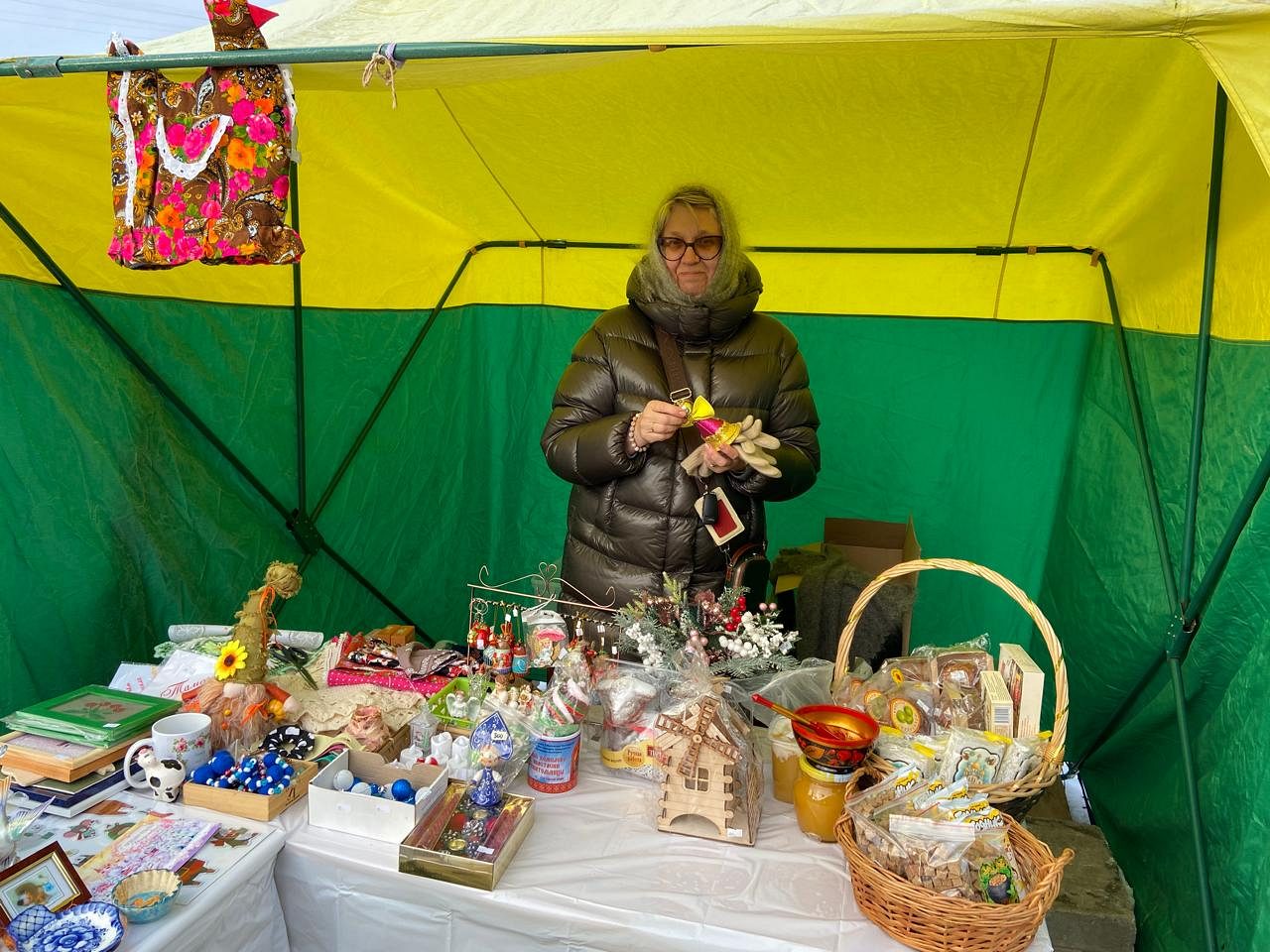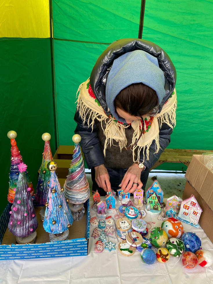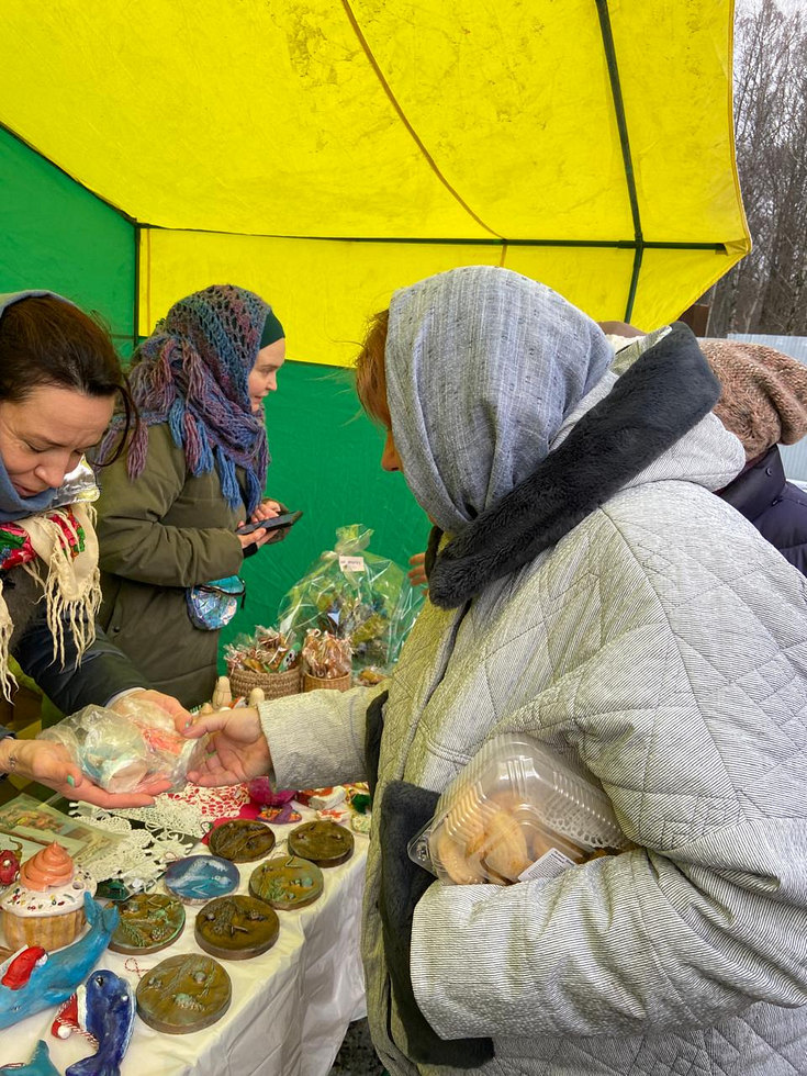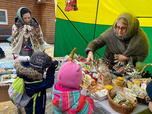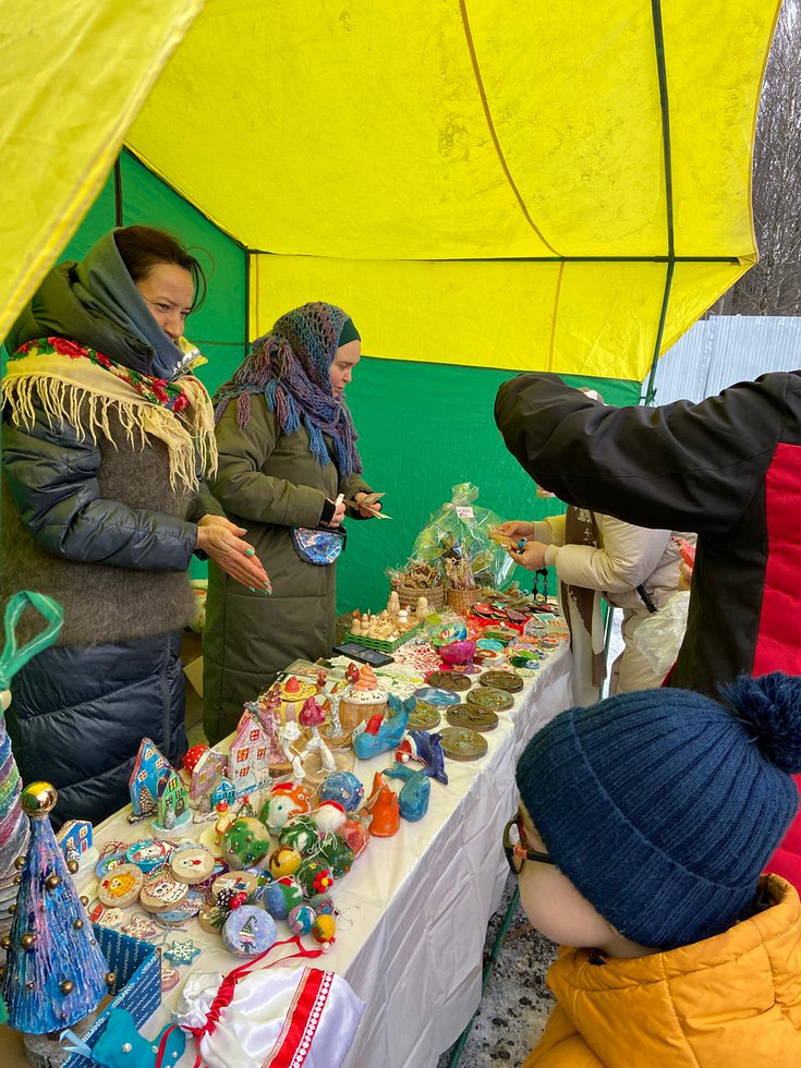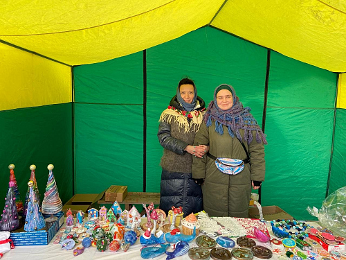 После Божественной Литургии прихожанам были предложены поделки, созданные детьми Воскресной школы под руководством преподавателей. Поделки - в основном игрушки на елку - были изготовлены из глины, гипса, бумаги, шерсти.