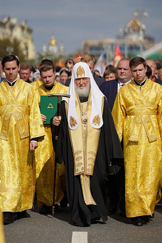 По завершении богослужения Предстоятель обратился к пастве с Первосвятительским словом, в котором благословил верующих на начало общегородского крестного хода по историческому маршруту: от кафедрального собора до Новодевичьего ставропигиального монастыря. Возглавив шествие, патриарх вместе с десятками тысяч верующих прошел по улицам Москвы с молебным пением Московским чудотворцам и угодникам Божиим.