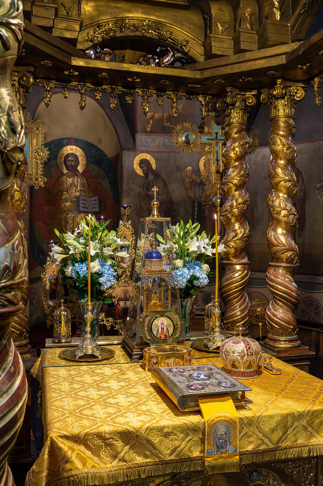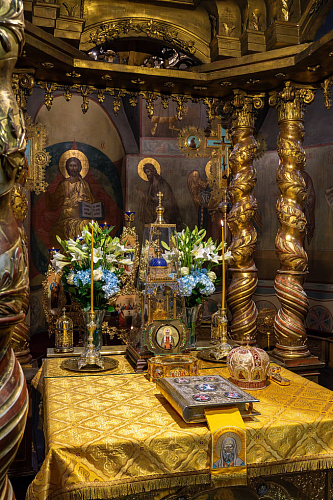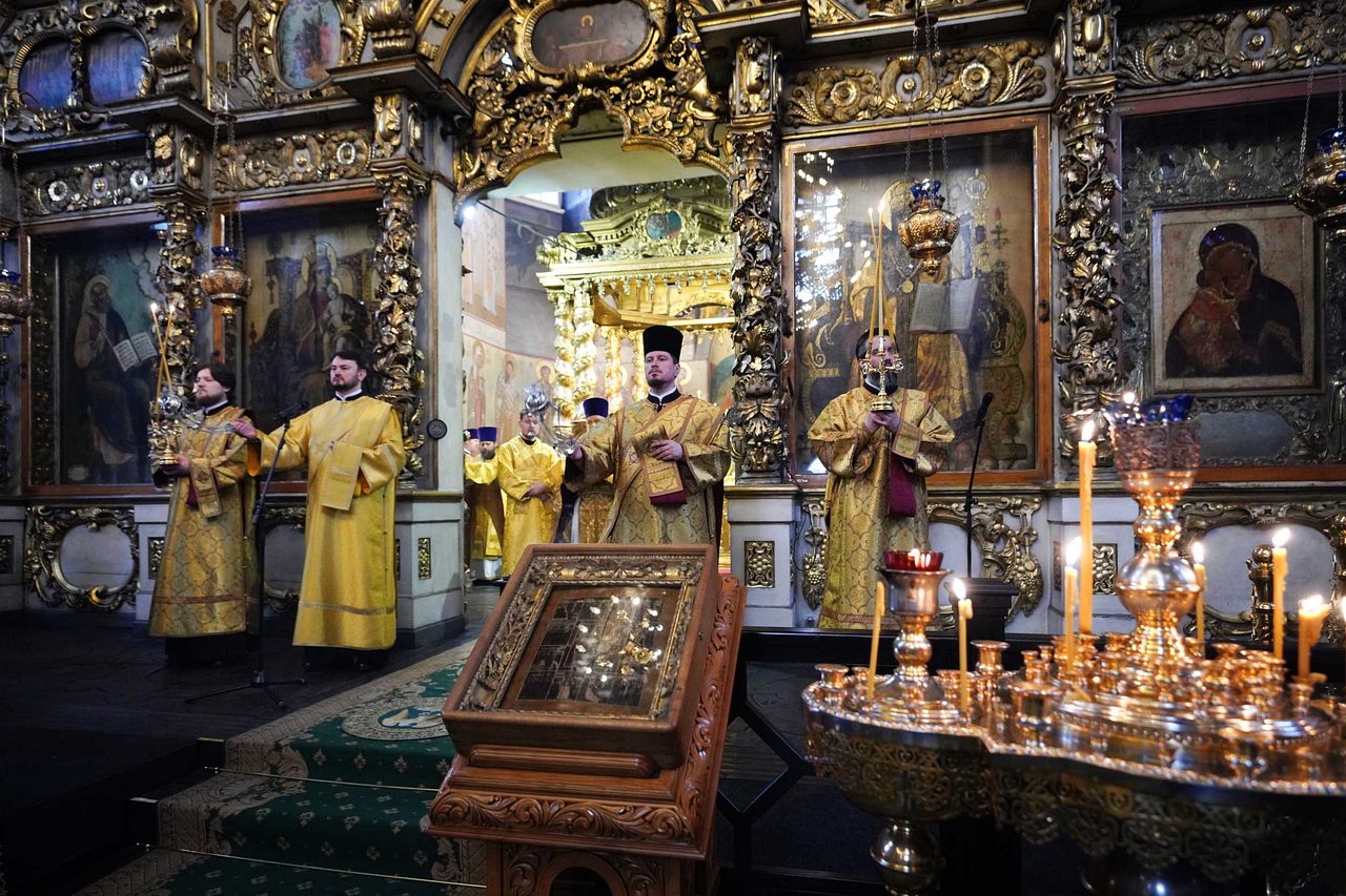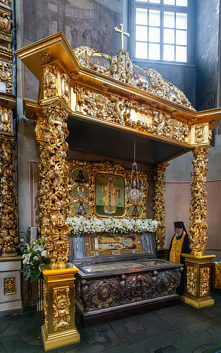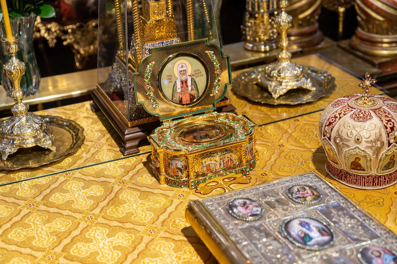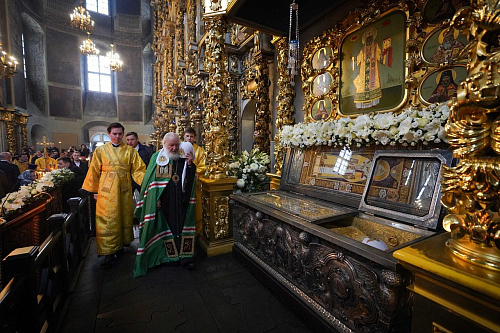 По завершении Литургии Святейший Владыка совершил славление и прочитал молитву у раки с мощами святителя.