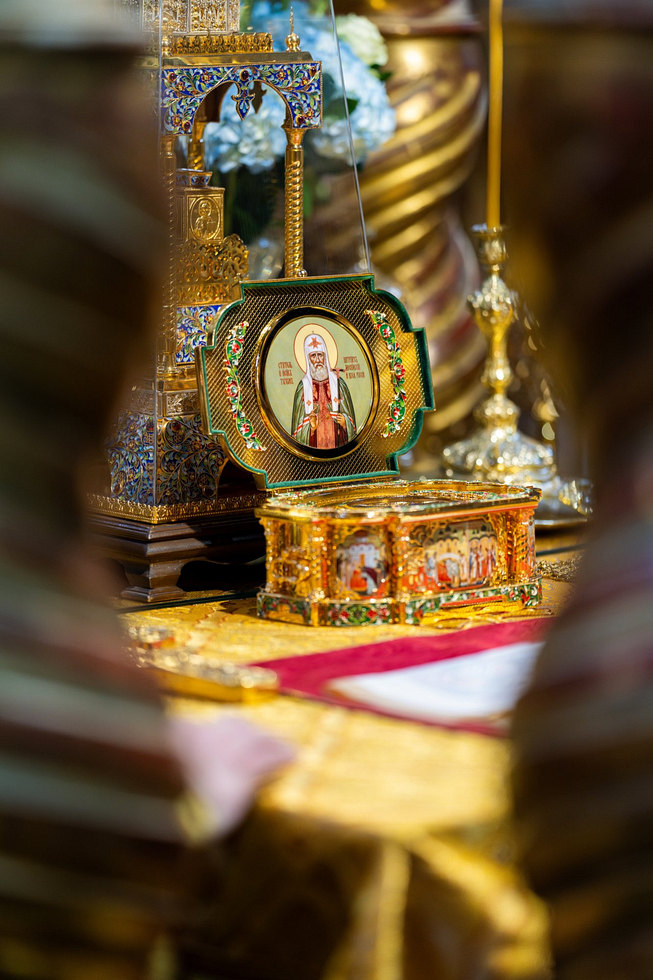 Ковчег с частицей мощей был создан мастерами Художественно-производственного предприятия «Софрино» специально для торжеств в честь 100-летия преставления святителя Тихона. Перед началом Патриаршего богослужения он был установлен на престоле Большого собора.