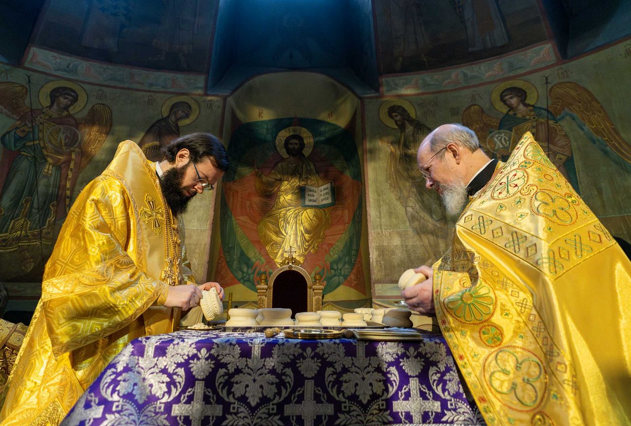 Перед причастием Патриарший архидиакон Константин Барган огласил Обращение Святейшего Патриарха Кирилла в связи со 100-летием со дня преставления святителя Тихона.