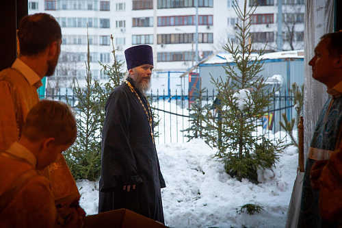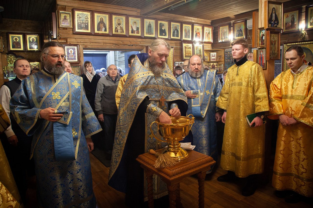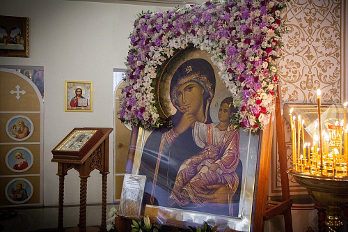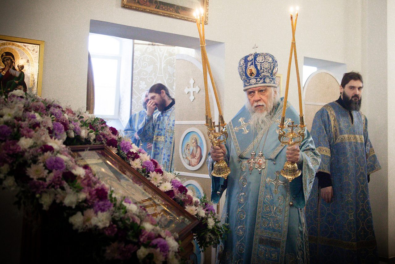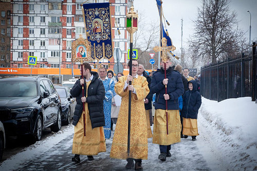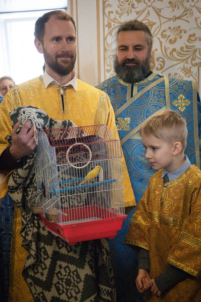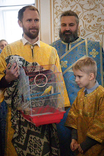 По окончании Богослужения, не смотря на зимнее время года, был совершен Крестный ход, на котором всех окропили святой водой. Уже в храме перед иконой Божией Матери «Отрада и Утешение», настоятель отец Александр сердечно поздравил всех присутствующих с престольным праздником, а Владыке преподнесли «живой» подарок – ярко-желтую канарейку.