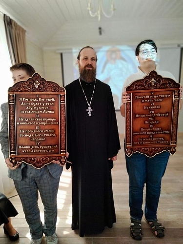 Иерей Иоанн Боков подарил Воскресной школе удивительные по красоте и исполнению «настоящие» Скрижали Завета с десятью Заповедями Божьими.