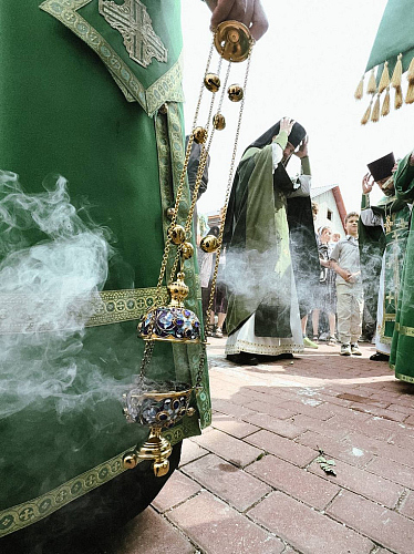 По окончании Божественной Литургии был совершен праздничный Крестный ход вокруг храма с чтением Евангелия и окроплением святой водой, затем в благоговейной обстановке была отслужена Великая вечерня с чтением коленопреклоненных молитв.