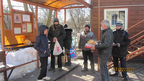 Волонтеры, представители приходского молодежного объединения храма готовят и ежедневно раздают горячие обеды для бездомных. Продукты жертвуют прихожане.