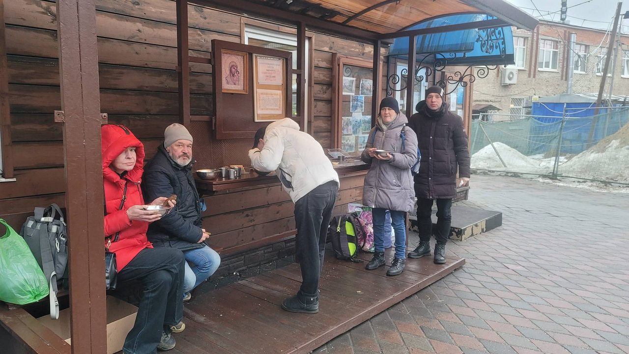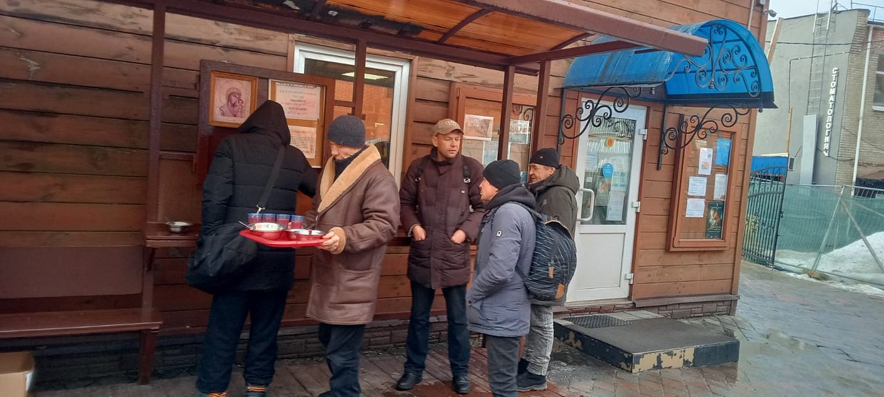 Волонтеры, представители приходского молодежного объединения храма готовят и ежедневно раздают горячие обеды для бездомных. Продукты жертвуют прихожане.