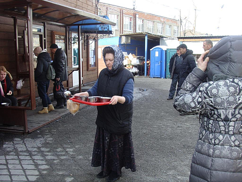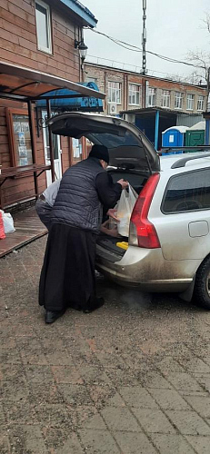 Волонтеры, представители приходского молодежного объединения храма готовят и ежедневно раздают горячие обеды для бездомных. Продукты жертвуют прихожане. В день удается накормить 15-30 человек.