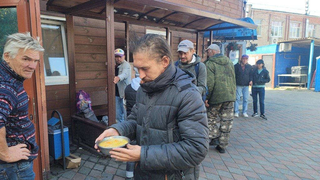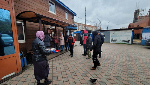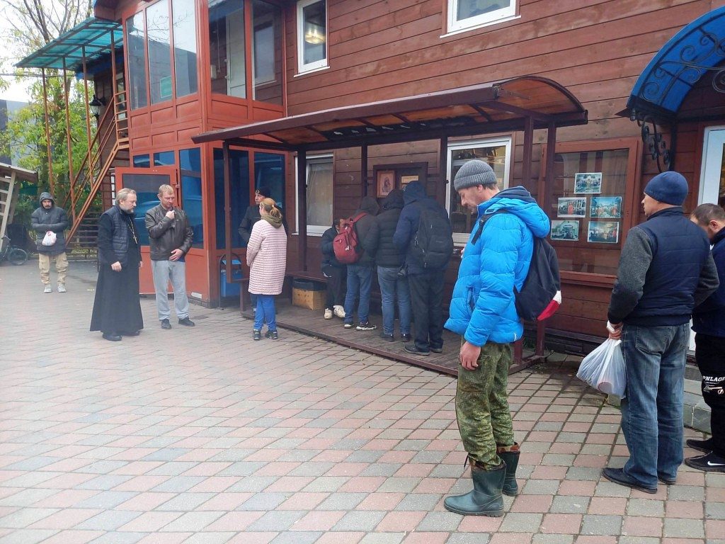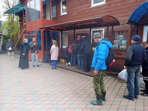 Волонтеры, представители приходского молодежного объединения храма готовят и ежедневно раздают горячие обеды для бездомных. Продукты жертвуют прихожане. В день удается накормить 15-30 человек.