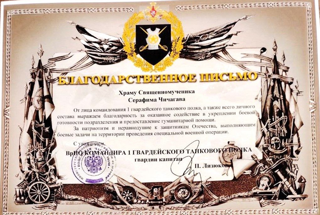 Прихожане храма собрали заготовки и парафин для окопных свечей и изготовили 130 свечей. Также были собраны теплые одеяла, кондитерские изделия, кофе, чай, средства личной гигиены, медицинские средства первой помощи и лекарства для военнослужащих. Всю гуманитарную помощь в размере 171 кг. отвезли на передовую в зону СВО, Первому Гвардейскому танковому полку. ВрИО Командира танкового полка гвардии капитан П. Лизюков передал храму сщмч. Серафима, митрополита Петроградского Благодарственное письмо за оказываемую приходом помощь, за патриотизм и неравнодушие к защитникам Отечества, выполняющим боевые задачи на территории проведения специальной военной операции.