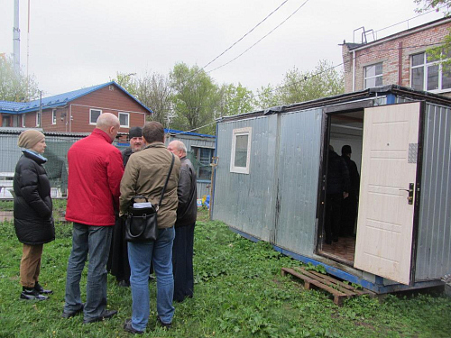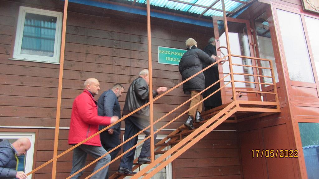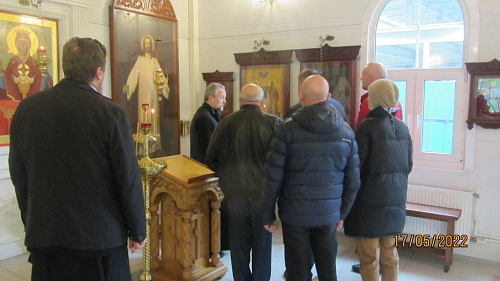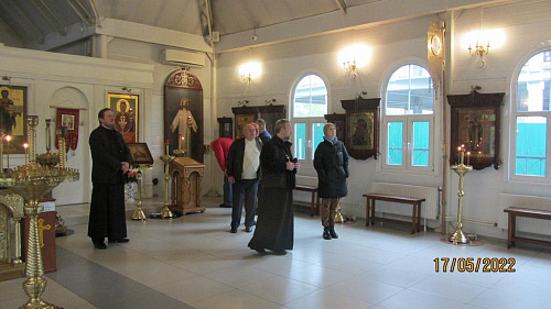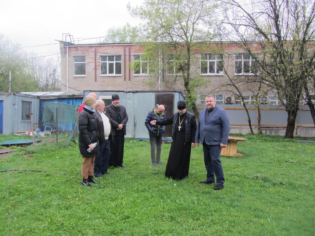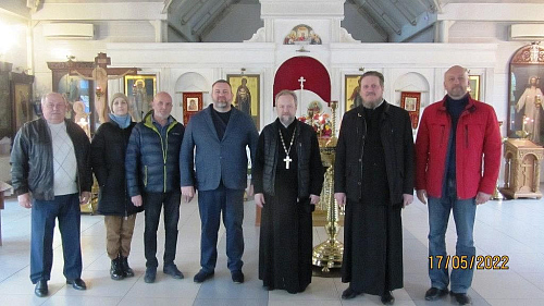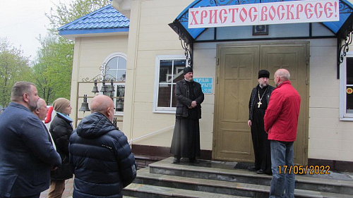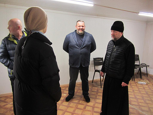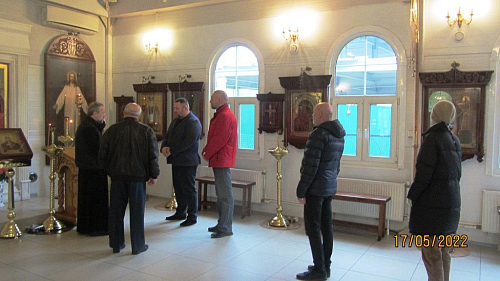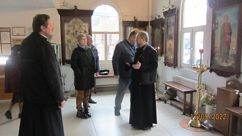 Настоятель храма пригласил присутствующих во временный храм, где рассказал о его строительстве, о подвиге священномученика Серафима, митрополита Петроградского, в честь которого будет построен основной храм.Далее настоятель храма рассказал о церковно-приходской деятельности, показал Воскресную школу храма.